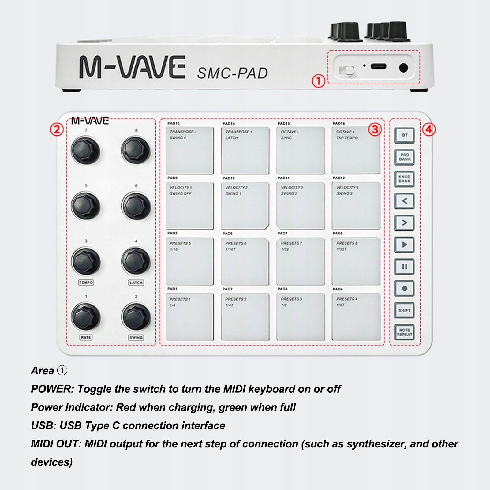 1. Специфікація: бездротовий контролер MIDI з 16 RGB -барабанними прокладками з функцією Aftertouch та 8 призначені обертовими ручками на 360 °. Оснащений функцією повторюваних нотаток та вихідного порту MIDI 3,5 мм, ідеально підходить для студії та ритмічного виробництва.