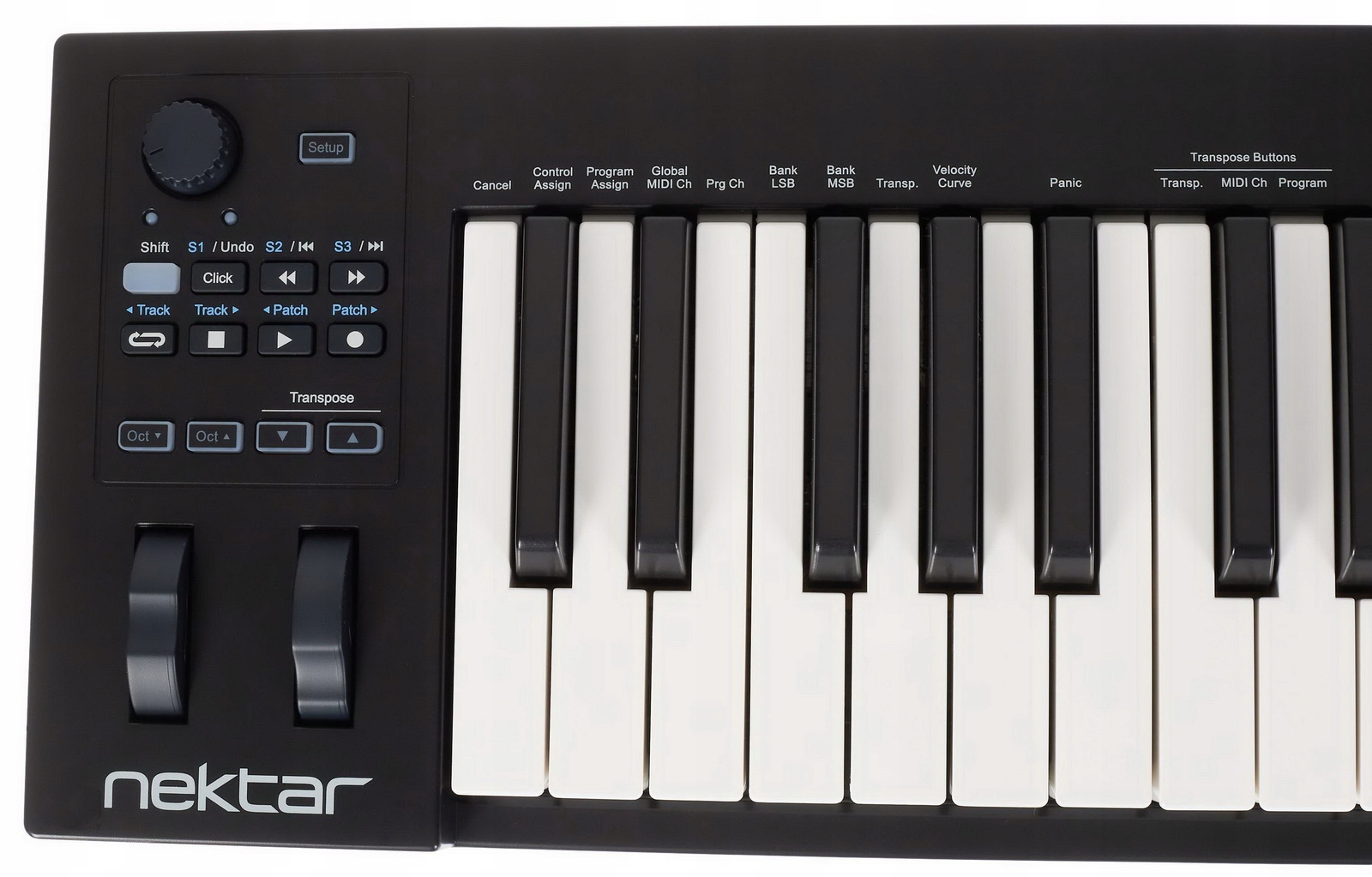 Спеціальні кнопки транспонування дозволяють «пересувати» клавіатуру на +/- 12 півтонів. Кнопки можна легко відновити до початкових налаштувань. Крім того, додатковий потенціометр забезпечує контроль над будь-яким параметром MIDI.