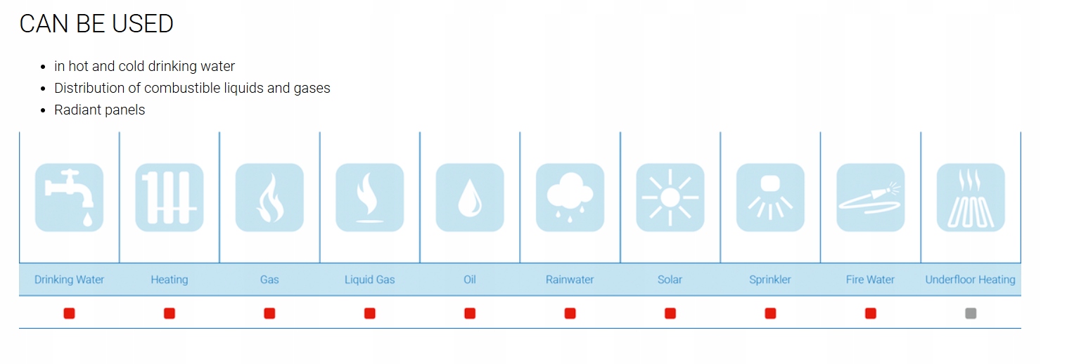 мідні труби, види Cu -dhp (99,9% Cu) без шва, призначеного для гасіння холодної та гарячої води, установки для нагріву, розподілу газу та рідкого палива для вживання в домашніх установах, страви, встановлення, установки, пожежного та тиску та вакуумування.