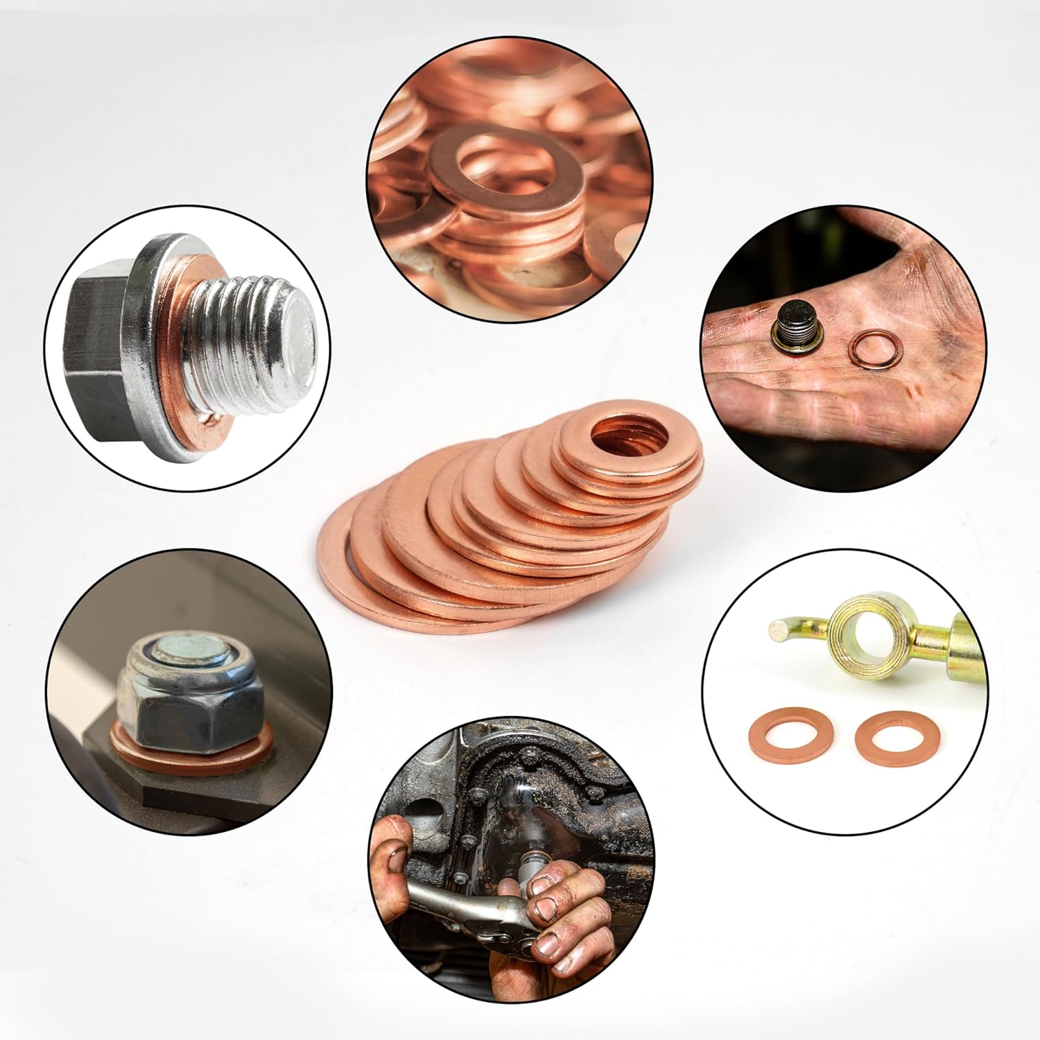 Набір високоякісних мідних прокладок, розроблених для різних технічних та семінарних програм. Ідеально підходить для автомобільної промисловості, сантехніків та при ремонті пристроїв, забезпечення ефективного ущільнення з'єднань. 4 Завдяки твердій продуктивності вони забезпечують тривалий термін і безпечне використання навіть у вимогливих умовах.