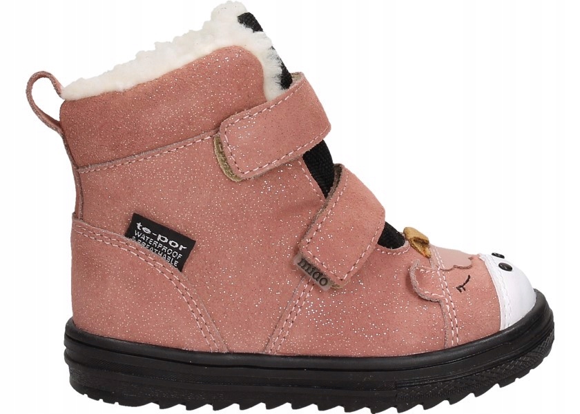 взуття Mido Model 32-27 дитяче взуття в рожевому кольорі з делікатними глянсовими частинками, водонепроникним з мембраною TE-POR. Виготовлений з високоякісної природної шкіряної шкіри. Взуття кріпиться на липучках. Зручний та ізольований інтер’єр з вставкою з теплоізоляційним шаром. Завдяки жорсткій п'яті та гнучкій підошві вони підтримують належний розвиток стопи. Підходить для температури вище 0? Завдяки використанню технології TE-POR®, взуття є водонепроникним. Мембрана TE-POR® супроводжує вологу зовні, завдяки чому стопа дитини суха під час використання. Оригінальний дизайн із чарівними єдинорогами на ногах сподобається кожній дитині. Розроблений та вироблений для здоров'я та комфорту дитини. Ідеально підходить для прогулянок та розваг на свіжому повітрі. Польський продукт.