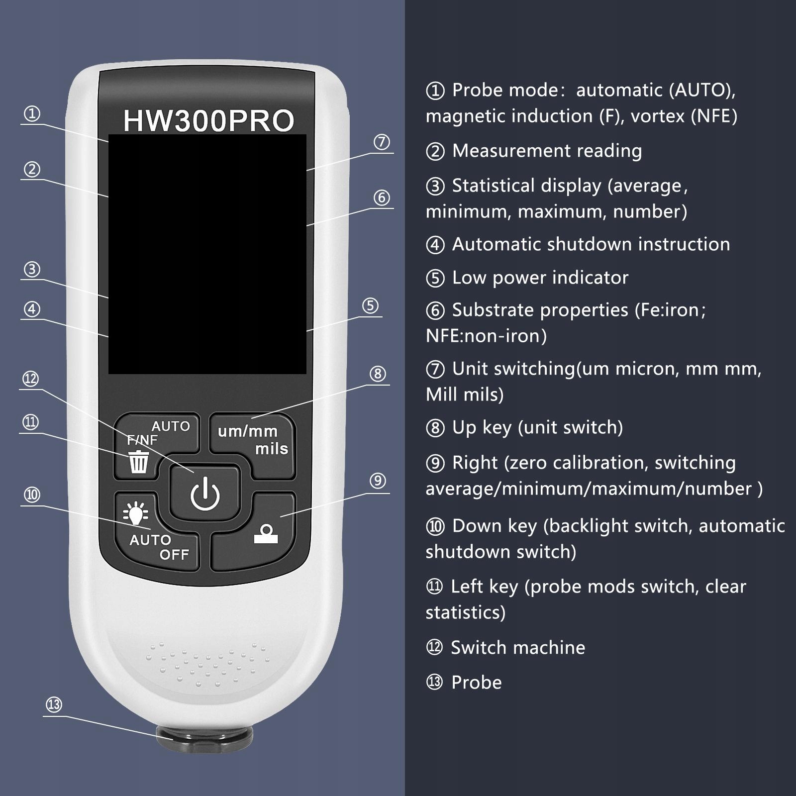 Точність: діапазон вимірювань 0-2000UM. Вимірювання покриття FE/NFE. Висока точність роздільної здатності до 1 мкм.