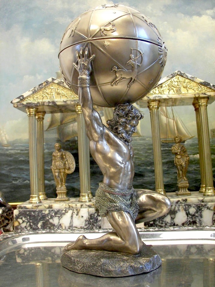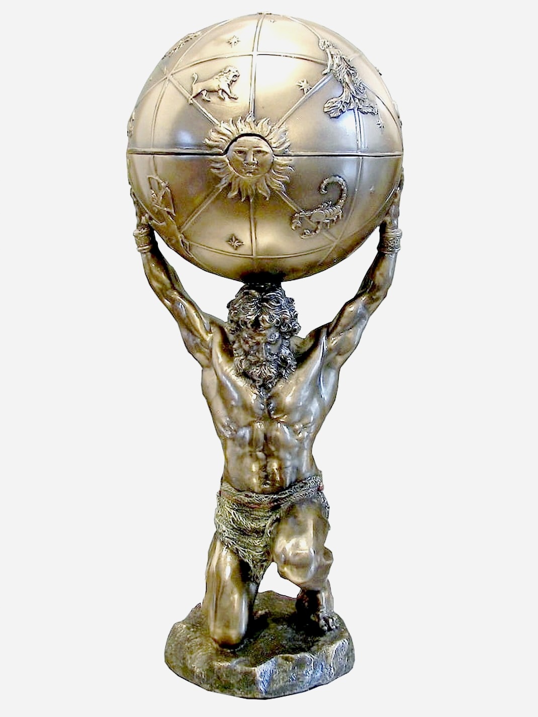 Запрошую придбати чудову фігурку із зображенням міфічного Атласа, що підтримує земну кулю, на якій зображені знаки зодіаку, які також є коробкою. Фігура атласа чудова, монументальна, благородне обличчя, ідеальні м'язи Статуетка з колекції VERONESE, продукт бренду вищого класу. Зверніть увагу на надзвичайно точне виконання, ми постаралися представити деталі на багатьох фотографіях. На природі предмет виглядає набагато краще.