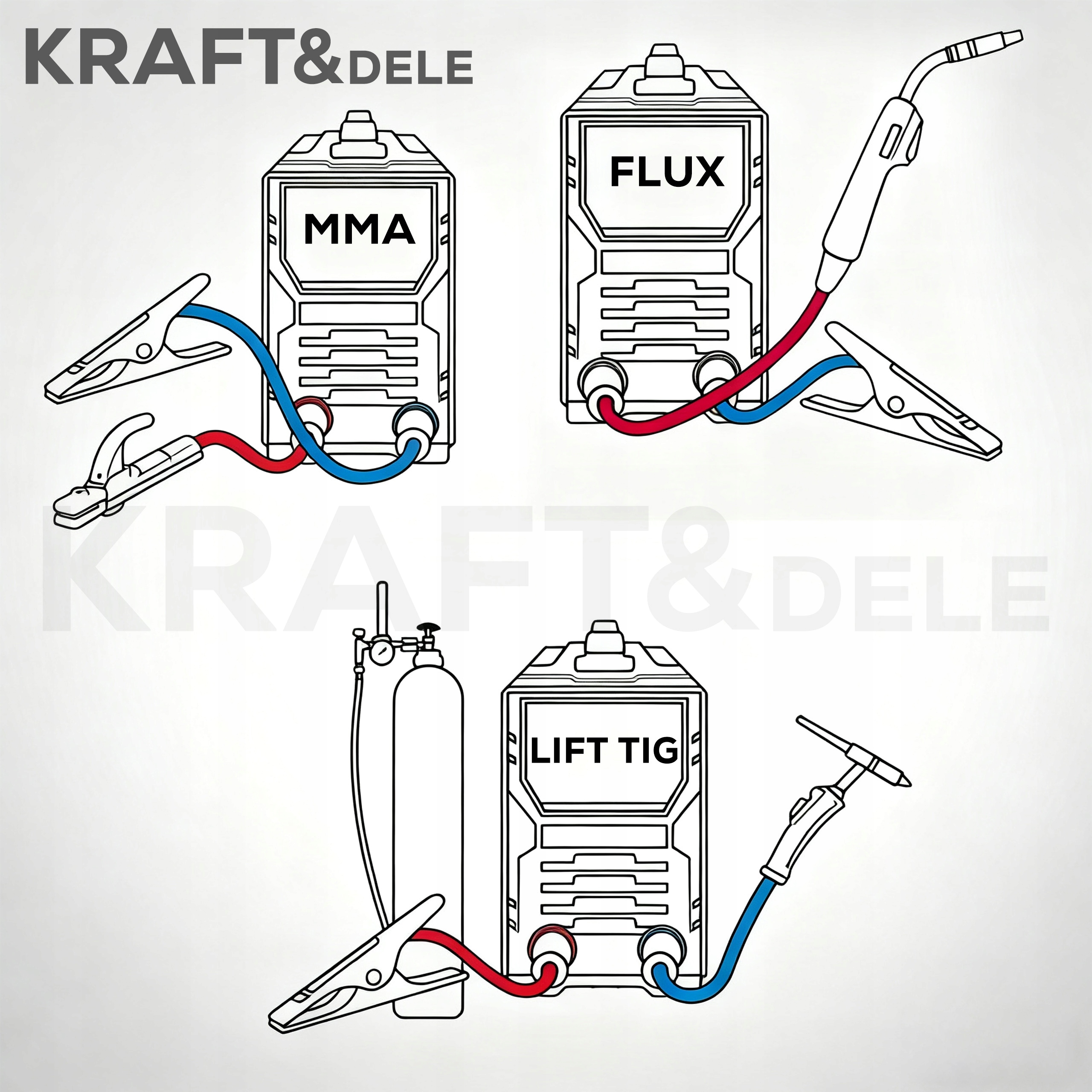 ⏩Апарат серії KRAFT&DELE - це зварювальний напівавтомат, призначений для зварювання сталі в газозахисному та самозахисному дроті FCAW (FLUX), MIG/MAG, MMA, TIG Lift (для цього необхідно придбати додаткову зварювальну ручку). Метод TIG Lift)