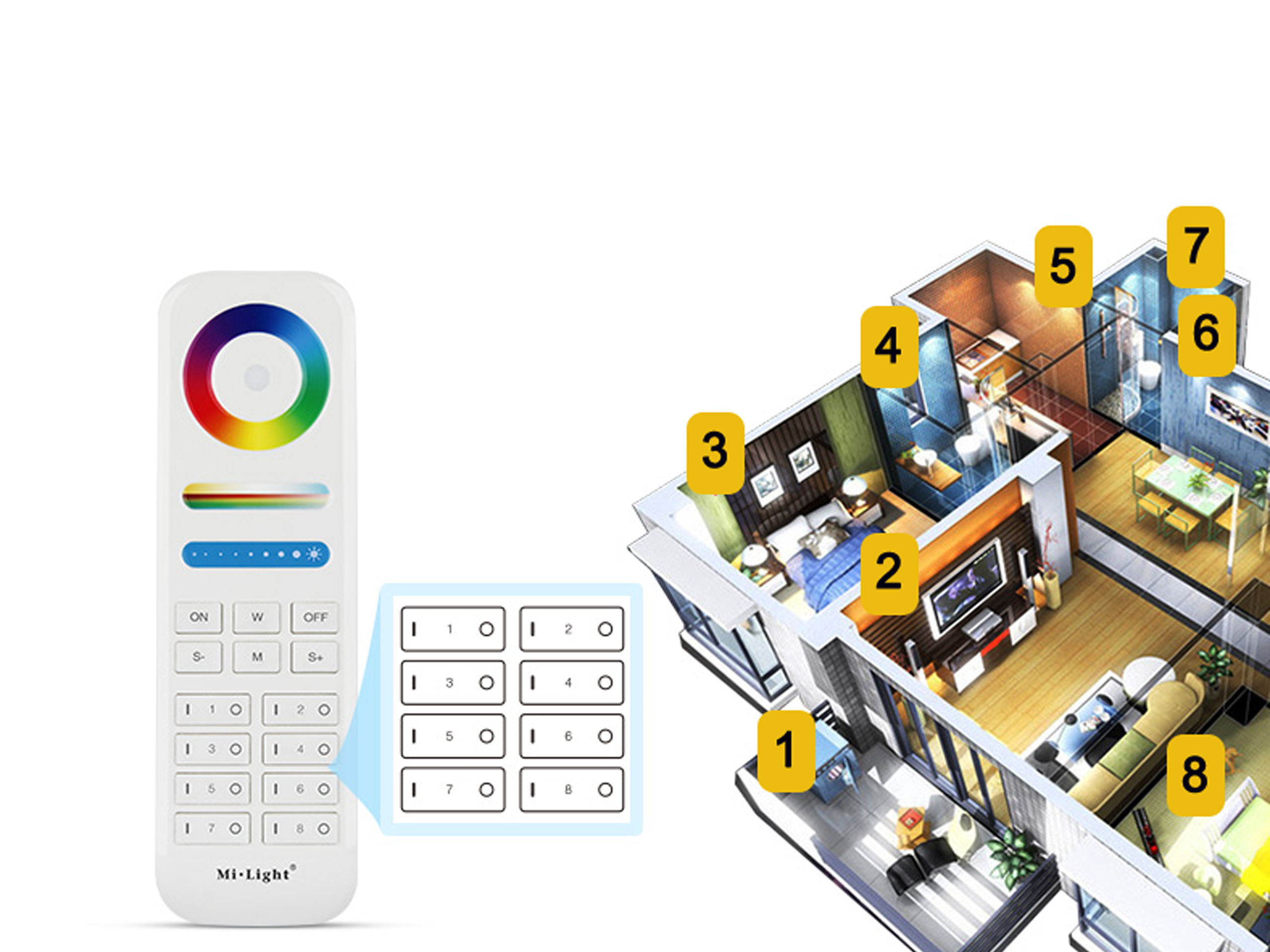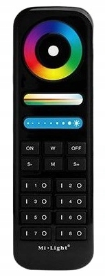 Дистанційне управління використовується для управління будь-яким типом світлодіодних стрічок за допомогою контролерів Miboxer/ Illight Zone (драйвери для купівлі на інших аукціонах). Зони освітлення. Драйвери 8 -Zone System мають функції аутотрансмісії та аутосинхронізації сигналу, що дозволяє одночасній роботі драйверів і дозволяє побудувати систему освітлення з елементів, віддалених від пульта дистанційного керування на будь -якій великій відстані (умова - контролери повинні бути віддаленими один від одного при відстані не більше 30 метрів). Колір за допомогою тактильного веселкового кола кола кольору, рідина затемнення та освітлення , зміна насичення кольору , додаючи біле світло (використовуючи відповідні світлодіодні стрічки), вибираючи одну з декількох динамічних програм змін, прискорюючи та випускаючи динамічні програми, має окрему ґудзик для кольору білого кольору.