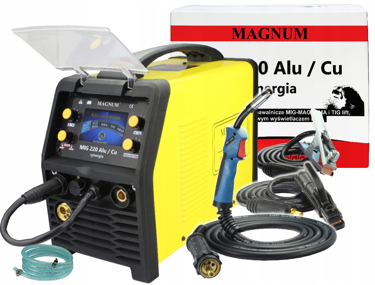 MIG 220 Alu / Cu Синергії марки Magnum Technological -Маг, ММА, ММА, ММА, TIG LIFT, FCAW та LUTOSPANIA. Призначений для ручного, електричного зварювання з низьким вмістом вуглецю, низького рівня, низького та високого сплаву, алюмінію та його сплавів, міді та його сплавів, lut -ups тощо