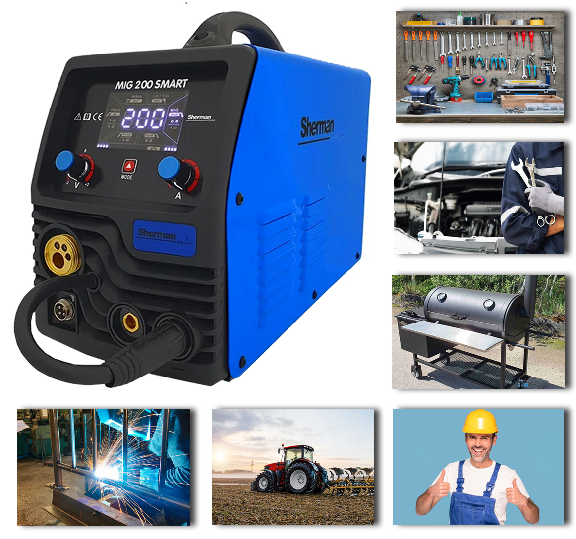 РОЗУМНИЙ ЗВАРЮВАЛЬНИЙ АПАРАТ SHERMAN MIG 200 - це інтуїтивно зрозумілий зварювальний апарат, який характеризується простотою, який неодмінно оцінять початківці зварювальники. Завдяки легкій вазі та компактній конструкції він ідеально підходить як портативний напівавтоматичний зварювальний апарат. Будь-які ремонтні роботи в полі є ідеальним завданням для цієї машини.