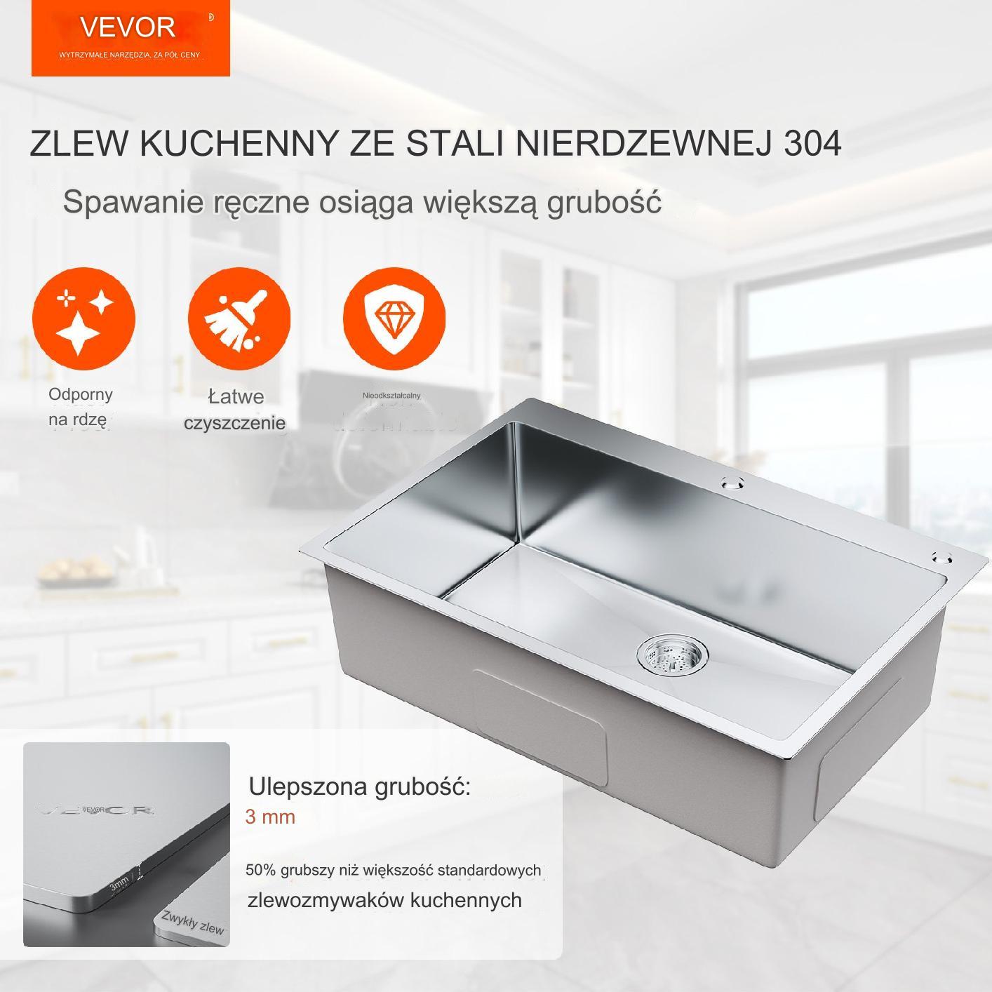 Виготовлена з високоякісної нержавіючої сталі 304, кухонна мийка надзвичайно міцна, стійка до іржі та легко чиститься. Збільшена товщина до 3 мм, що на 50% товщі стандартних раковин, забезпечує додаткову міцність. Мийка має зовнішні розміри 838 x 558 мм і внутрішні розміри 788 x 457 мм і глибину 230 мм, що дозволяє зручно мити великі каструлі та форми для печива, а також ховати брудний посуд.