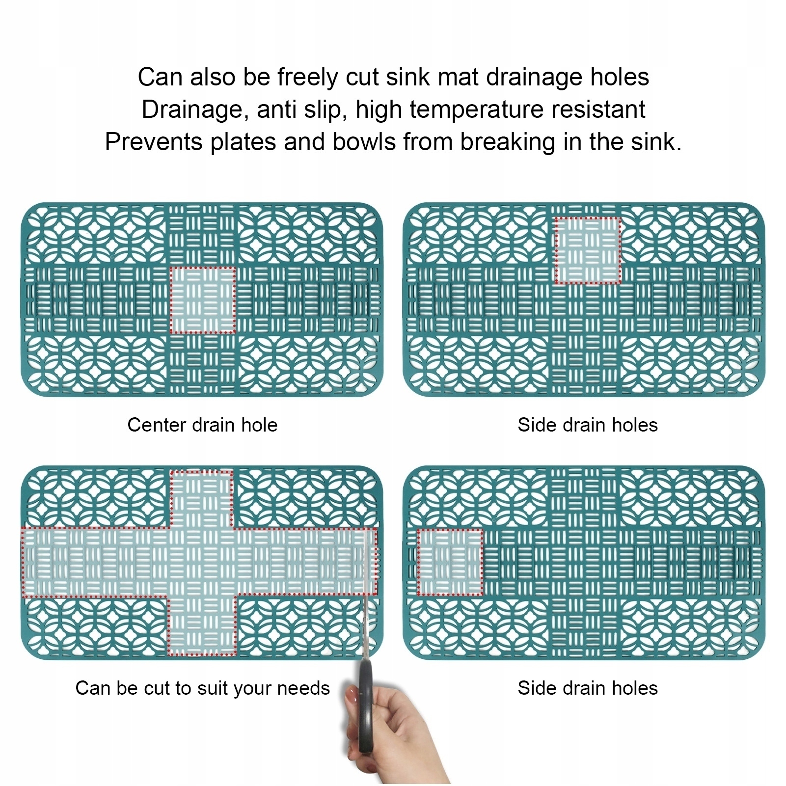 2. Конструкція з можливістю різання: цей килимок до раковини можна вирізати, що дозволяє вирізати отвір у зливному отворі, щоб краще поміститися збоку від раковини і ідеально підходити до кухонної раковини.