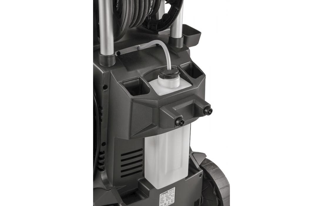 10-метровий шланг високого тиску виготовлений із армованого матеріалу. і може намотуватися на барабан з алюмінієвими напрямними. Засіб для очищення автоматично забирається з фурми з регульованою головкою, яка контролюється ручкою, розташованою на передній частині пристрою. Великі гумові колеса та телескопічна ручка полегшують маневрування на очищених поверхнях.