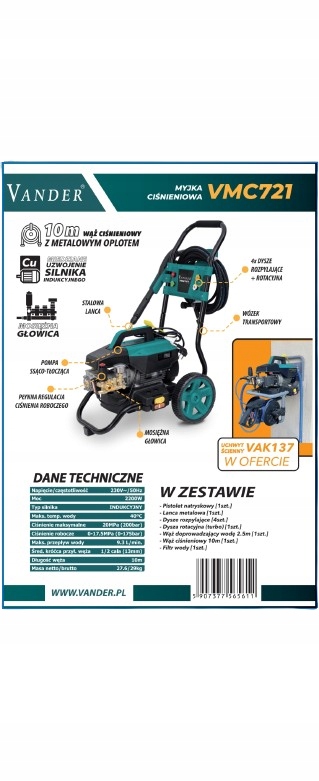 Оплачивая «Мойка высокого давления Vander VMC721 мощностью 2200 Вт.», вы можете быть уверены, что данный товар из каталога «Мойки высокого давления» будет доставлен из Польши и проверен на целостность. В цене товара, указанной на сайте, учтена доставка из Польши. Внимание!!! Товары для Евросоюза, согласно законодательству стран Евросоюза, могут отличаться упаковкой или наполнением.