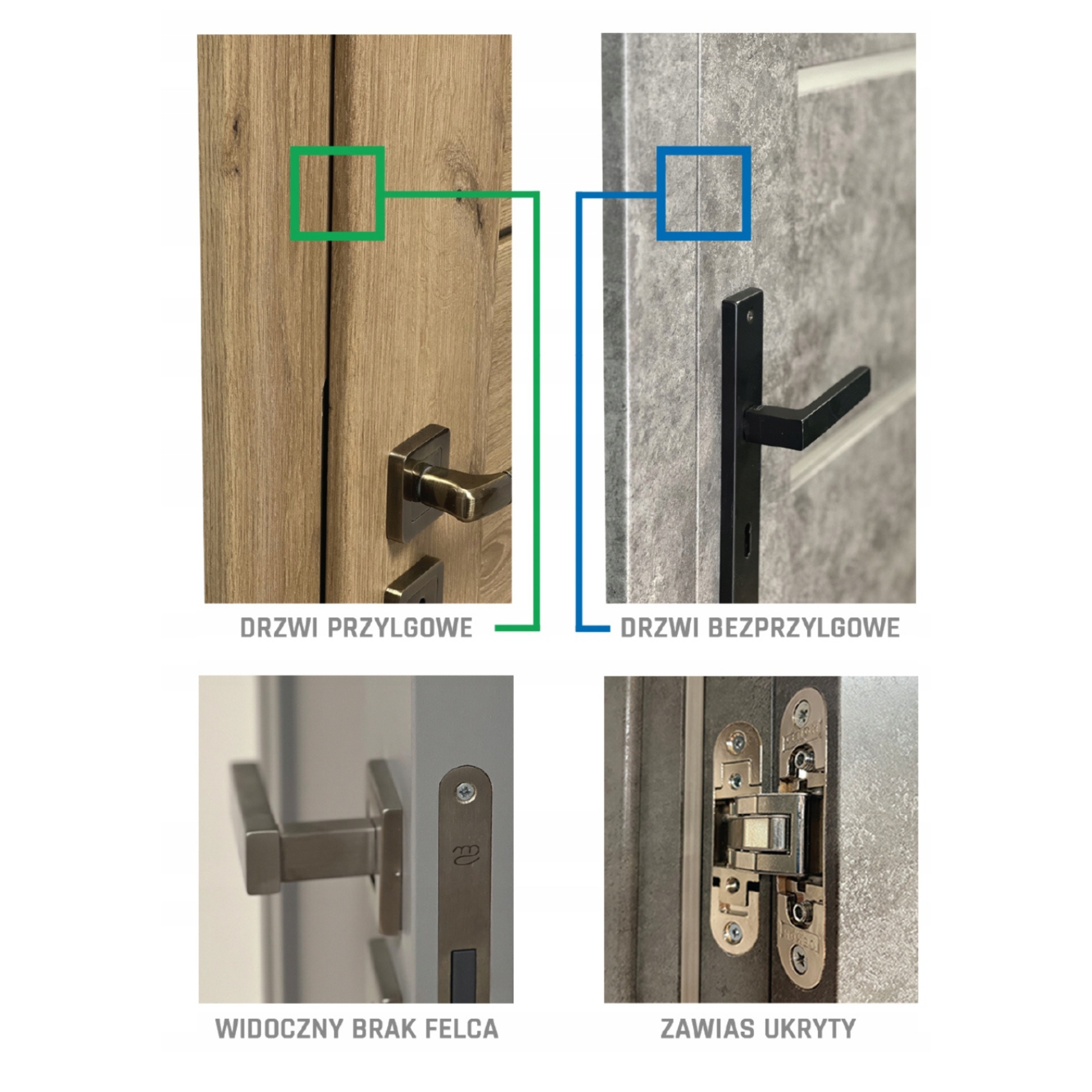 Сучасна версія дверей, яка разом із спеціальною дверною рамою створює однорідну гладку поверхню. Відсутність фальца і двох щілинних (стільникові) або прихованих (версія SOLID) петель надають мінімалістичний дизайн. Версія без фальца також має магнітний замок із тихим закриванням для комфортного використання.