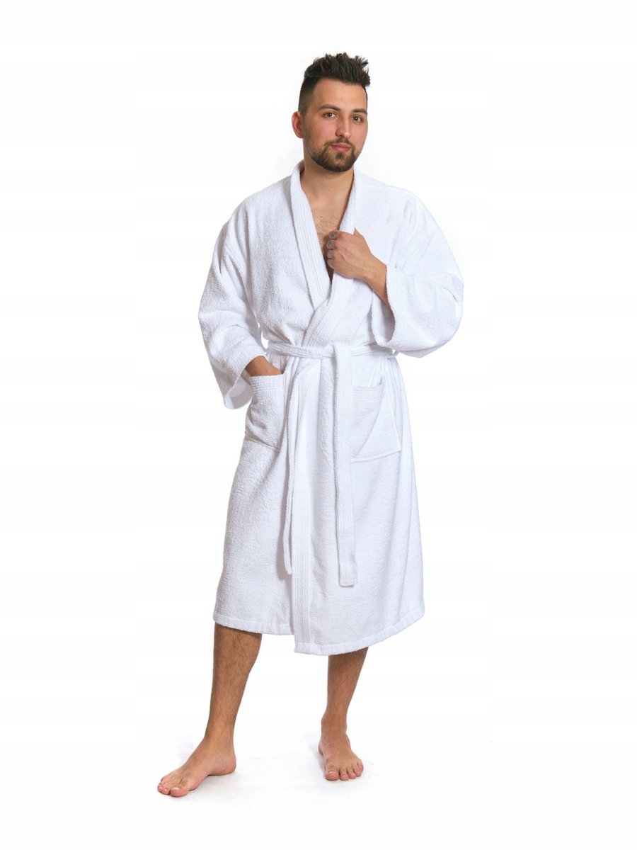 чоловічий халат виготовлений з 100% бавовняного террі Сертифікат Öko-Tex®. Бавовна Террі має характерно довше щетину o Завдовжки 5 мм, він м'який на дотик і приємний на тілі. Цей елегантний розріз Кімоно містить дві кишені, петлю та пояс для зв’язку.