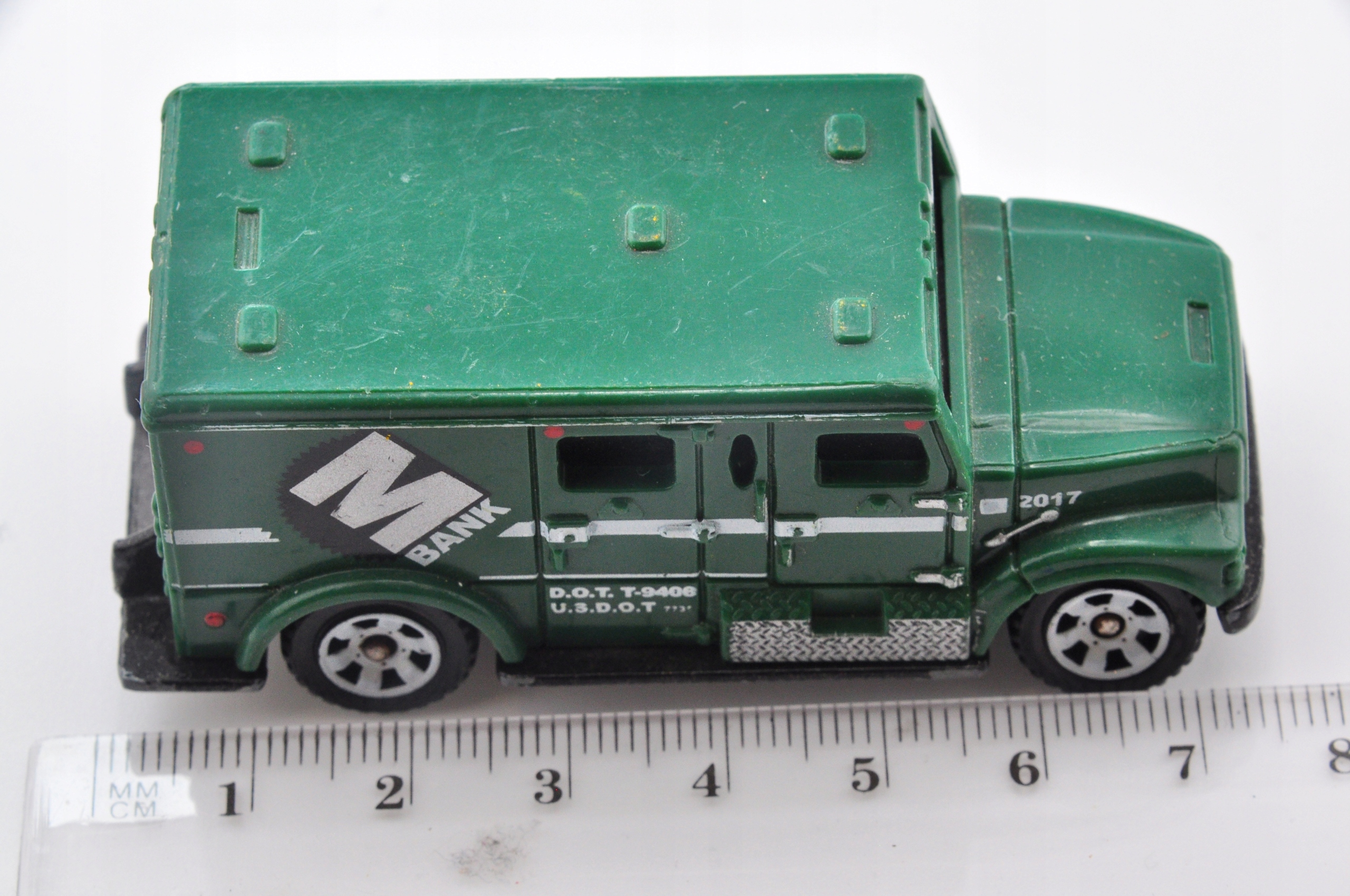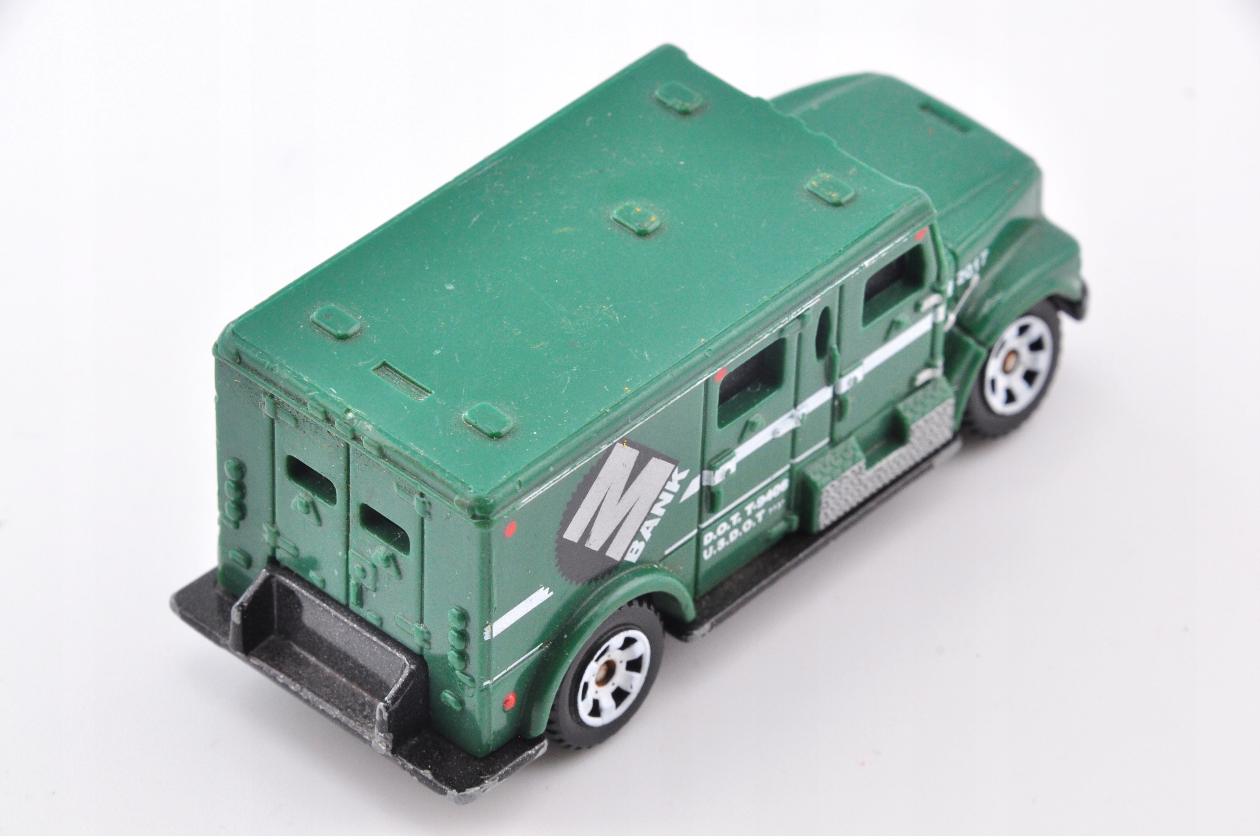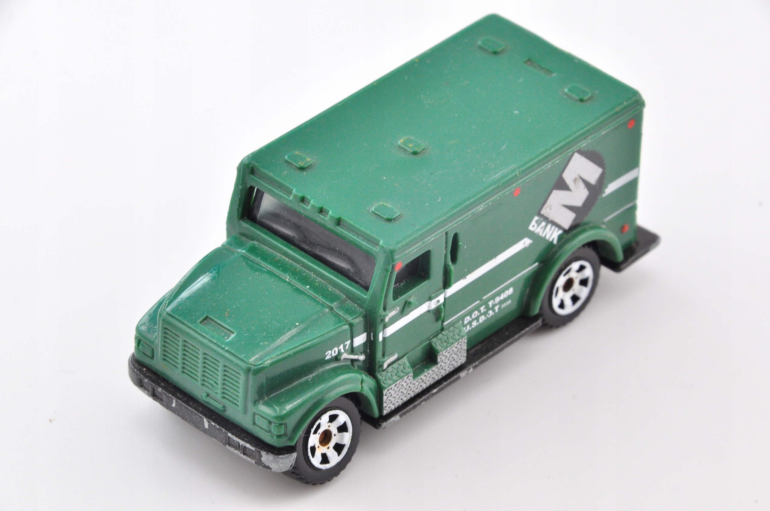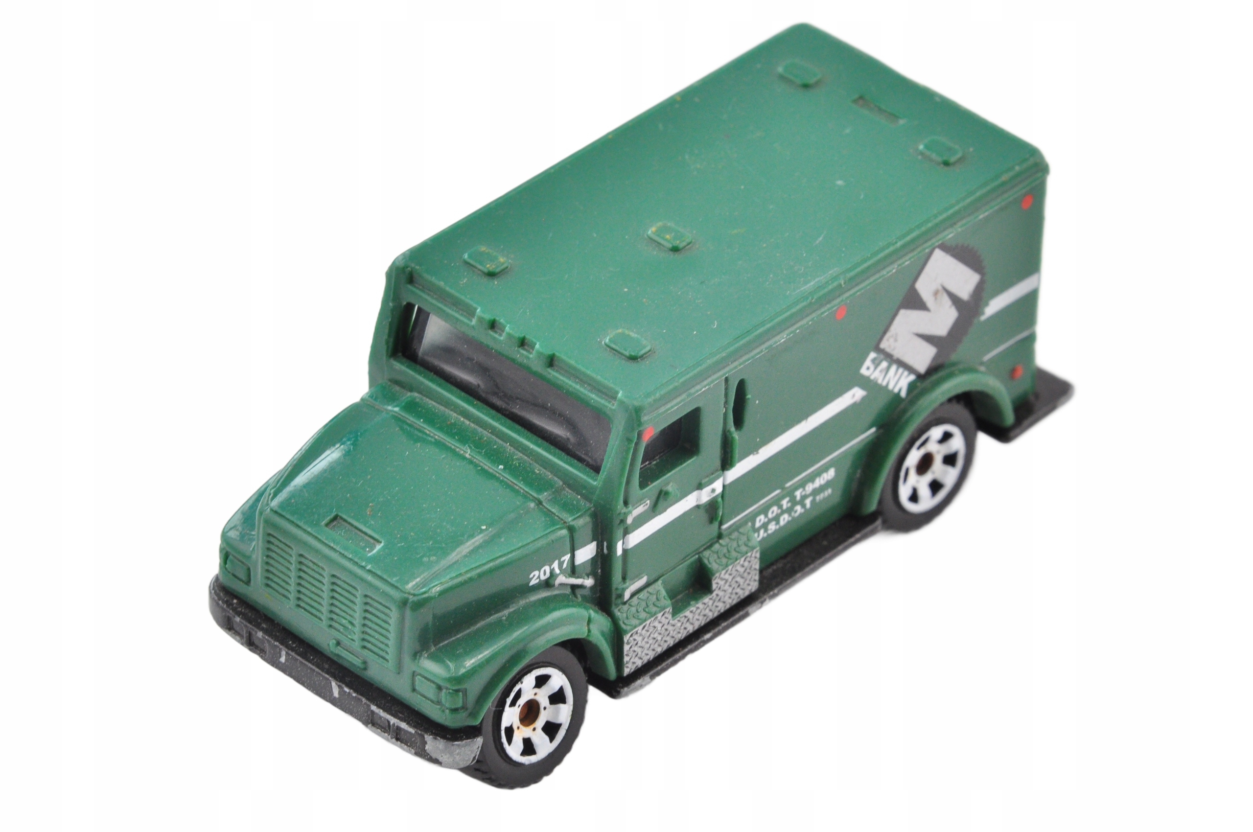 Ця весна є моделлю бронеавтомобільного банківського транспортного засобу, який привертає увагу своєю суцільною конструкцією та детальною обробкою. Зроблена з металевого корпусу з пластиковими аксесуарами, модель міцна і відтворює деталі реального автомобіля. Зелені кольори з білими та чорними акцентами та банківськими відбитками надають йому характер. Незважаючи на видимі ознаки використання, модель приваблива для колекціонерів, які цінують справжність та точність.
