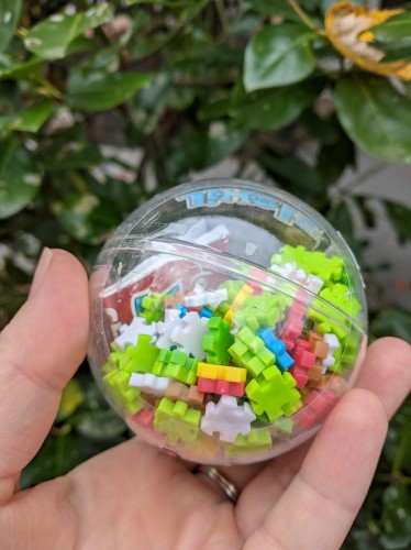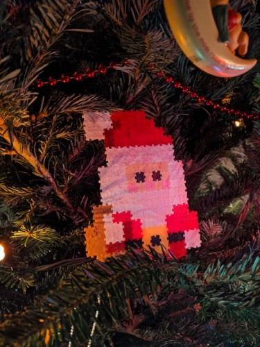 Прозора кулька, яку можна повісити на ялинку, наповнена щонайменше 150 точно вирізаними шматочками піксельної головоломки, з яких можна створити Святого. Діда Морозаі прикрасити ним свою ялинку та дім.