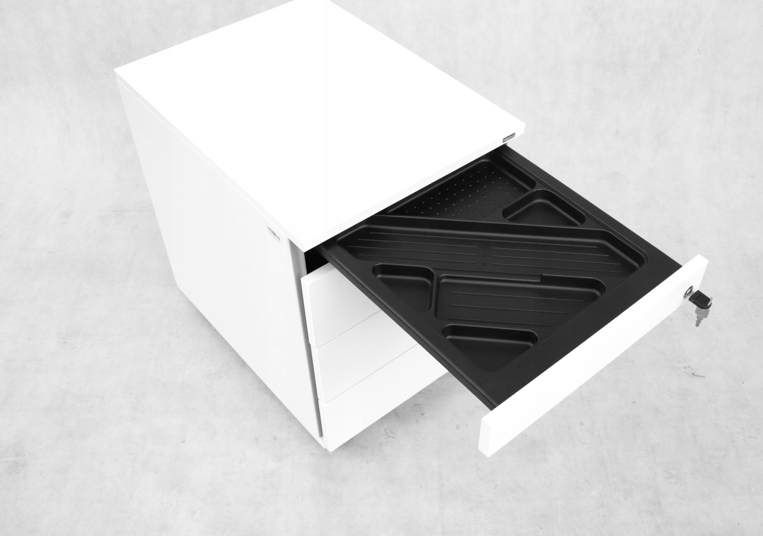 Контейнер Mikomax виготовлений з високоякісних матеріалів, що робить його придатним не тільки для домашнього використання, але і для інтенсивного використання в офісних приміщеннях. Органайзер має 4 шухляди, які допоможуть вам упорядкувати офісні речі. На дні контейнера є коліщатка, які дозволяють вільно переміщати його в просторі під столом. Усе замикається.