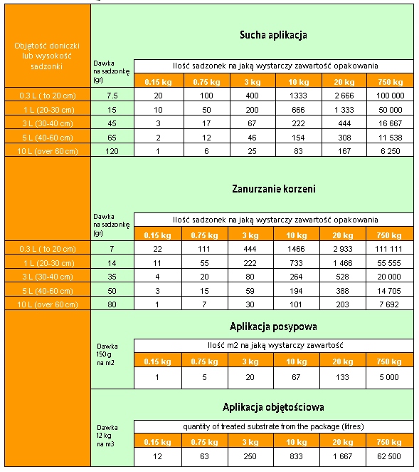 Приклад: a 750 грам упаковки достатньо для застосування приблизно 80-200 квіткових рослин, наприклад, балконних квітів, або 200 саджанців помідорів, або 100 саджанців винограду, або 80 саджанців яблунь.