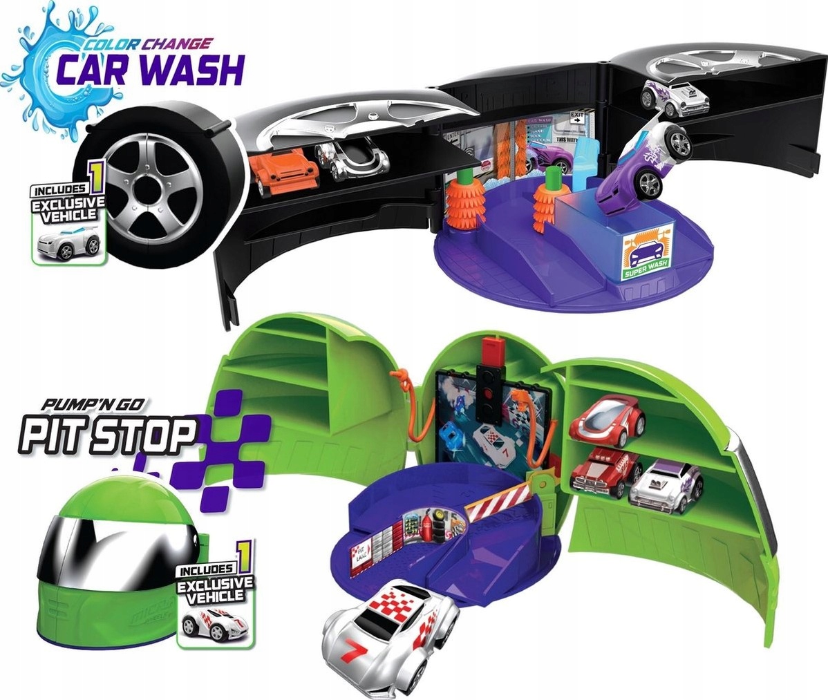 Який ексклюзивний автомобіль захований у цьому наборі? Деякі автомобілі навіть змінюють колір під впливом води! Припаркуйте свої автомобілі за допомогою піт-стопу у формі шолома! Шолом Micro Wheels може вмістити до 8 транспортних засобів Micro Wheels.