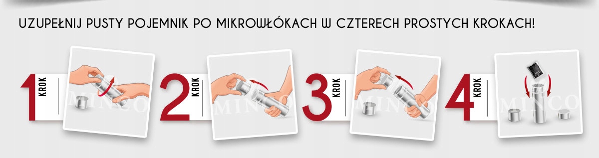 Замовте саше MINCO, відкрийте його та насипте стільки мікроволокон, щоб заповнити контейнер не більше ніж на 3/4 його об’єму. Закрити кришку. Тепер ви можете зробити своє волосся мікроволокнами найвищої якості за низькою ціною.