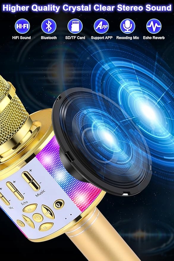 Візьміть вечірку на вищий рівень завдяки bonaok 4 в 1 мікрофон ! Цей бездротовий мікрофон караоке є ідеальним рішенням як для дітей, так і для дорослих, що гарантує радість та незабутні спогади. Завдяки барвистих вогнів блимаючи до ритму музики, кожна подія стане більш ефективною.