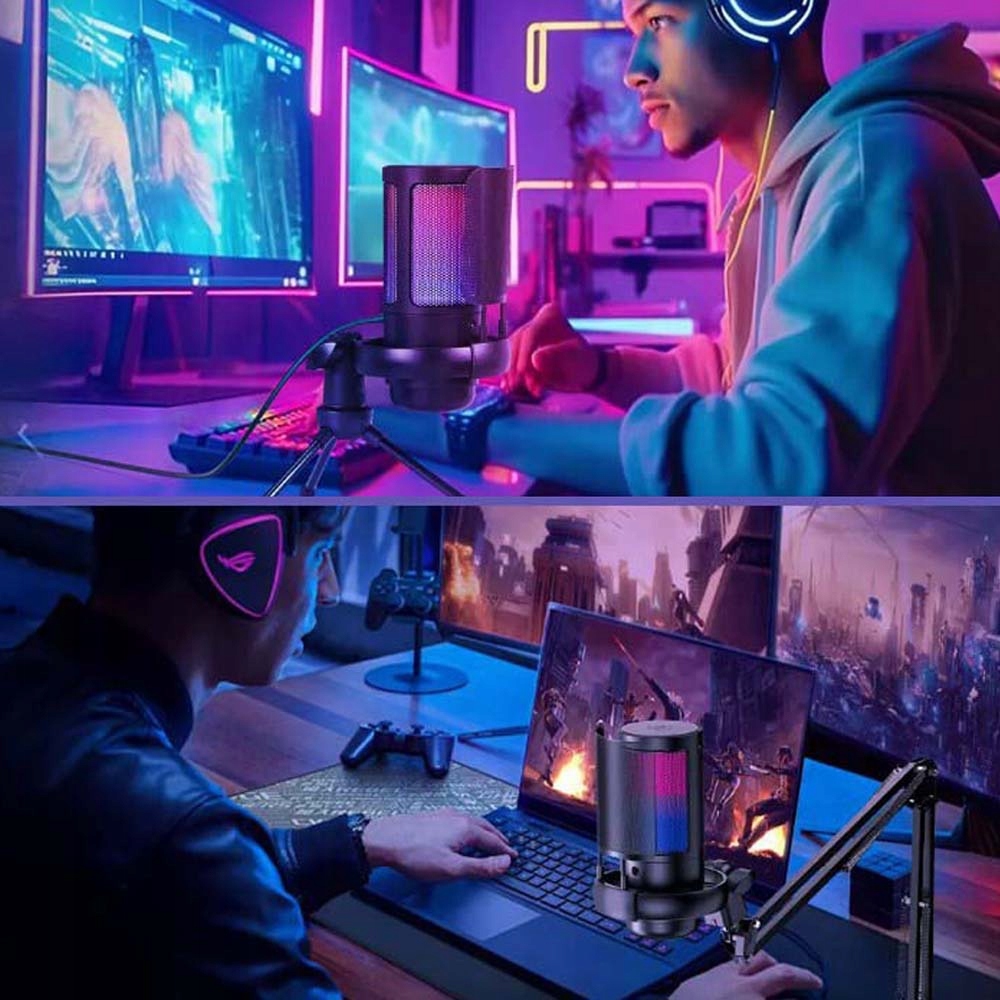 ✅【Практичні характеристики】Ручки та потоковий мікрофон регулюються. USB-мікрофон можна легко розташувати під потрібним кутом або по висоті, щоб показати свій ідеальний голос. Коли мікрофон комп’ютера вимкнено, увімкнеться RGB-індикатор, а RGB-індикатор увімкнеться. Індикатор увімкнення звуку засвітиться, щоб ви могли швидко перевірити статус.
