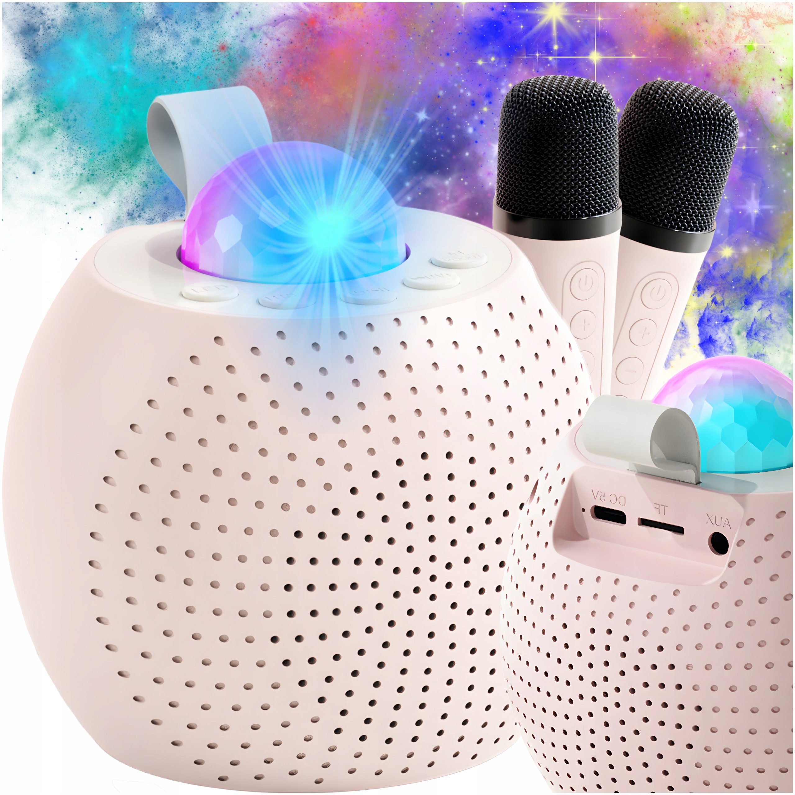 ➡️Динамік і мікрофони: Компактний динамік розміром 10,5 см x 10,5 см забезпечує портативність і чудову якість звуку. Два рожеві бездротові мікрофони (13,5 см x 3,7 см) дозволяють дітям співати разом і насолоджуватися музикою.