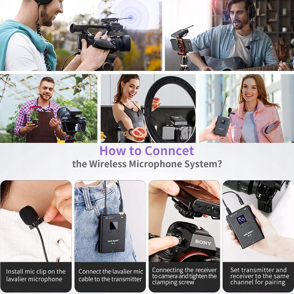 Сумісність із широким роз’ємом 3,5 мм. Мікрофонна система M9 широко сумісна зі смартфонами, камерами та відеокамерами з роз’ємом 3,5 мм. Ми поставляємо кабелі-конвертери 3,5 мм для телефону та камери. Ви також можете підключити мікрофонну систему до пристроїв Type-C і Lightning Jack за допомогою адаптерів