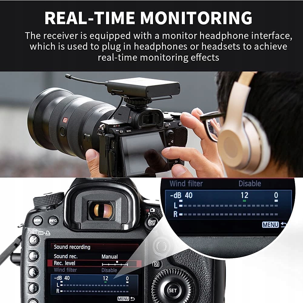 Моніторинг у реальному часі: система бездротового накладного мікрофона має порт монітора для навушників на приймачі, тож слухати та встановлювати рівні перед записом досить легко, стежити за станом звуку, щоб завершити запис у один раз.