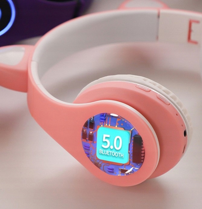 Стильні та зручні бездротові навушники Bluetooth із можливістю відтворення через роз’ємний кабель або SD-карту. Вуха-ріжки, підсвічені кольорами веселки, можна вмикати або вимикати, а вбудований мікрофон і кнопки керування дозволяють повністю контролювати, не тягнучись до телефону. Ідеально підходить для співу, прослуховування та створення власних списків відтворення.