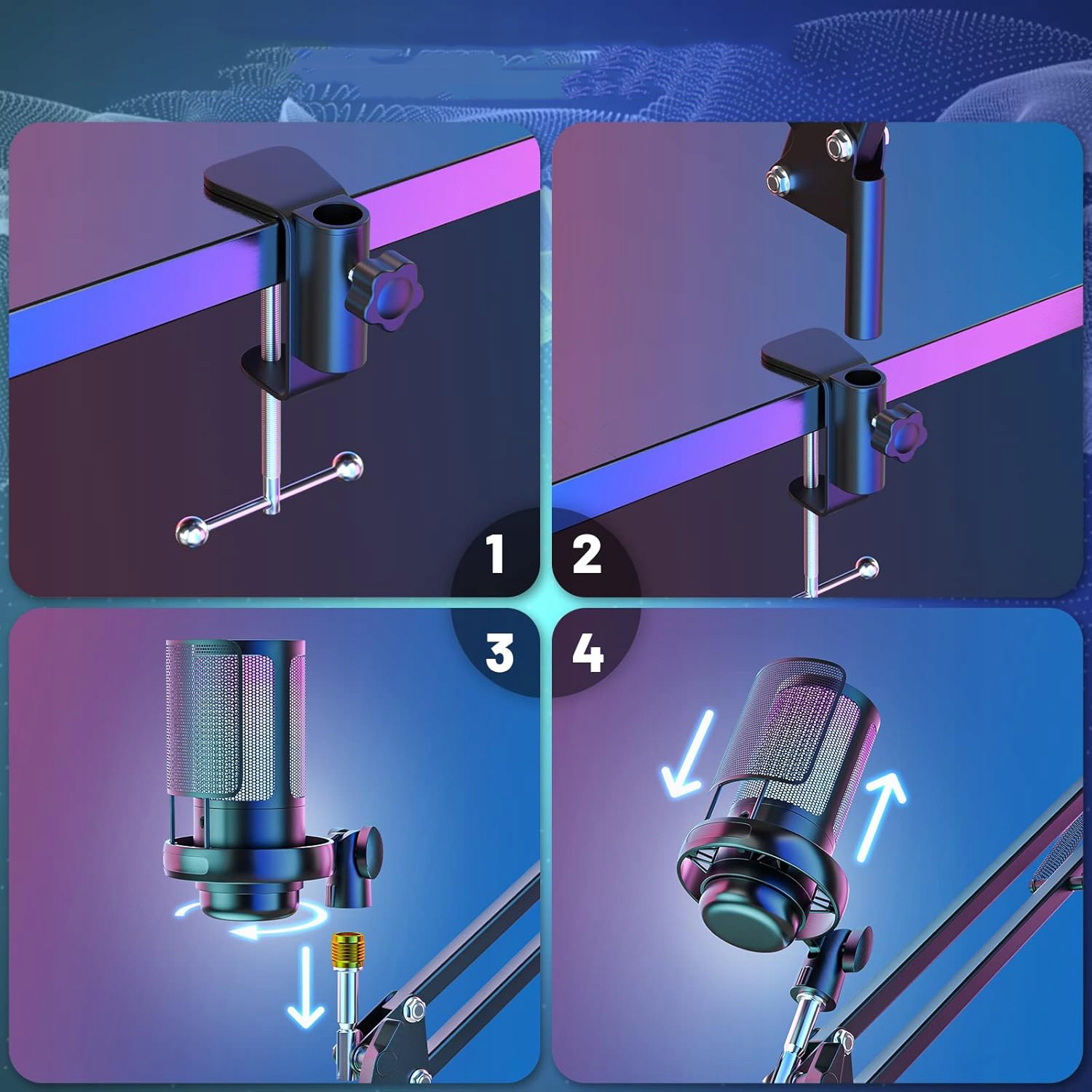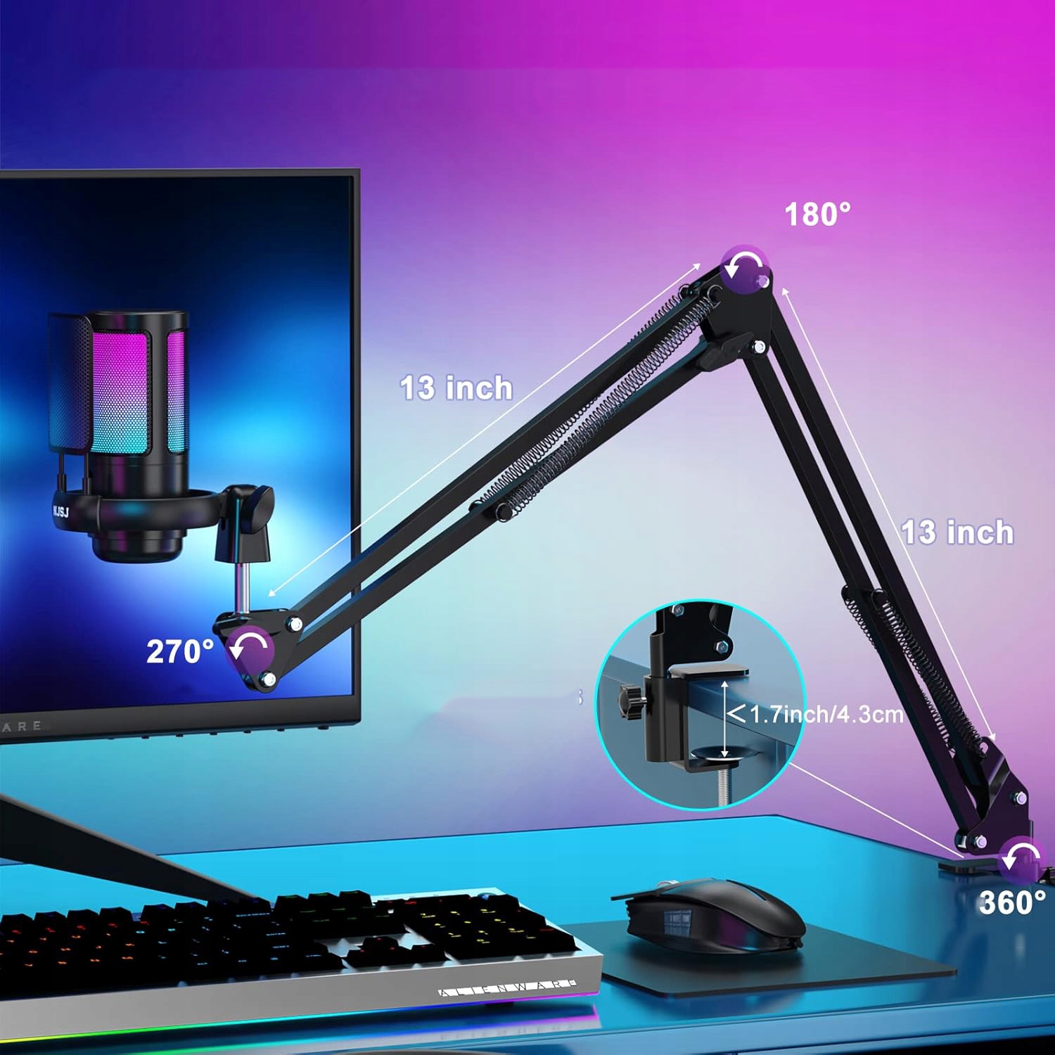 🎙️🎙️🎙️【Ідеальний комплект кронштейна для мікрофона】: Комп’ютерний мікрофон постачається з комплектом для кріплення на штанзі. Металева рука досить міцна, а С-подібний затискач ідеально підходить для більшості столів товщиною до 1,6 дюйма. Губка на основі підставки для ігрового мікрофона може захистити стіл від подряпин при затягуванні бічних гвинтів. І кронштейн, і мікрофон можна регулювати, тому ви можете легко налаштувати USB-мікрофон під відповідним кутом або висотою, щоб отримати ідеальний звук.