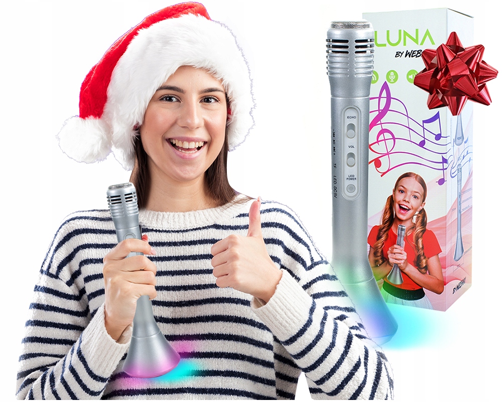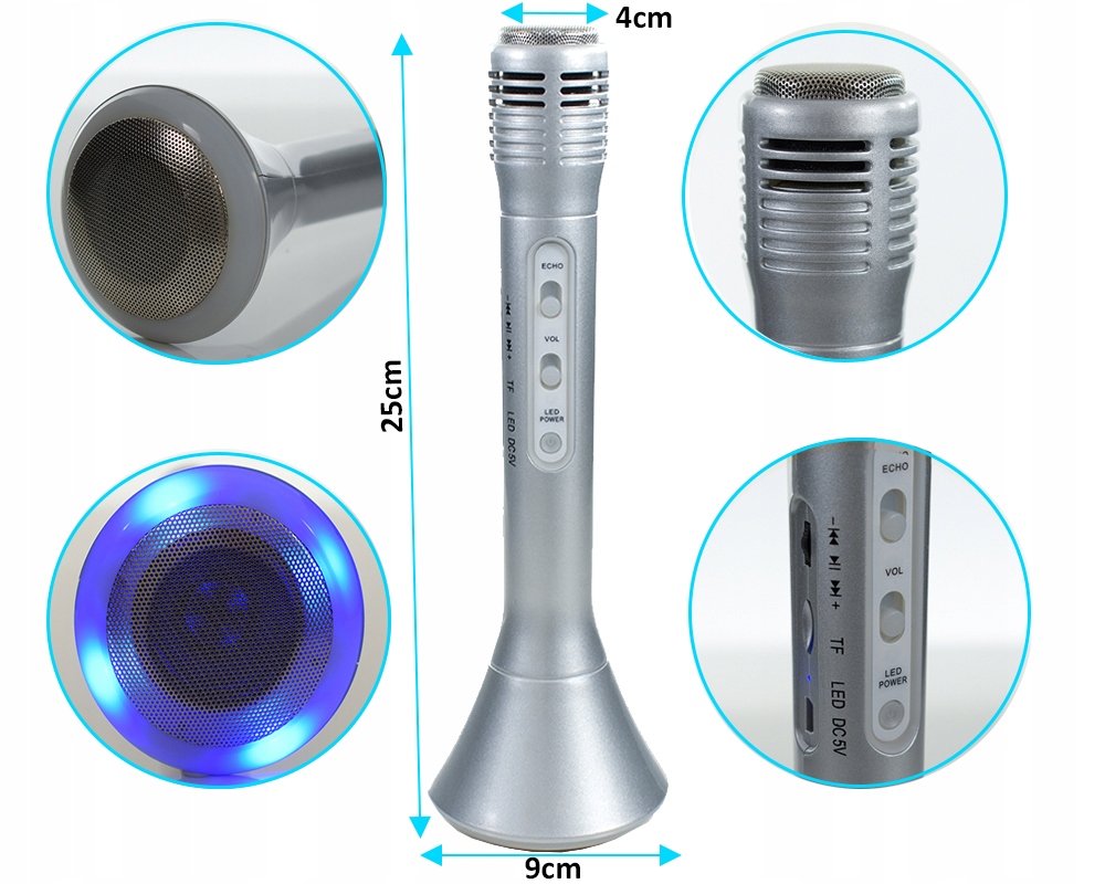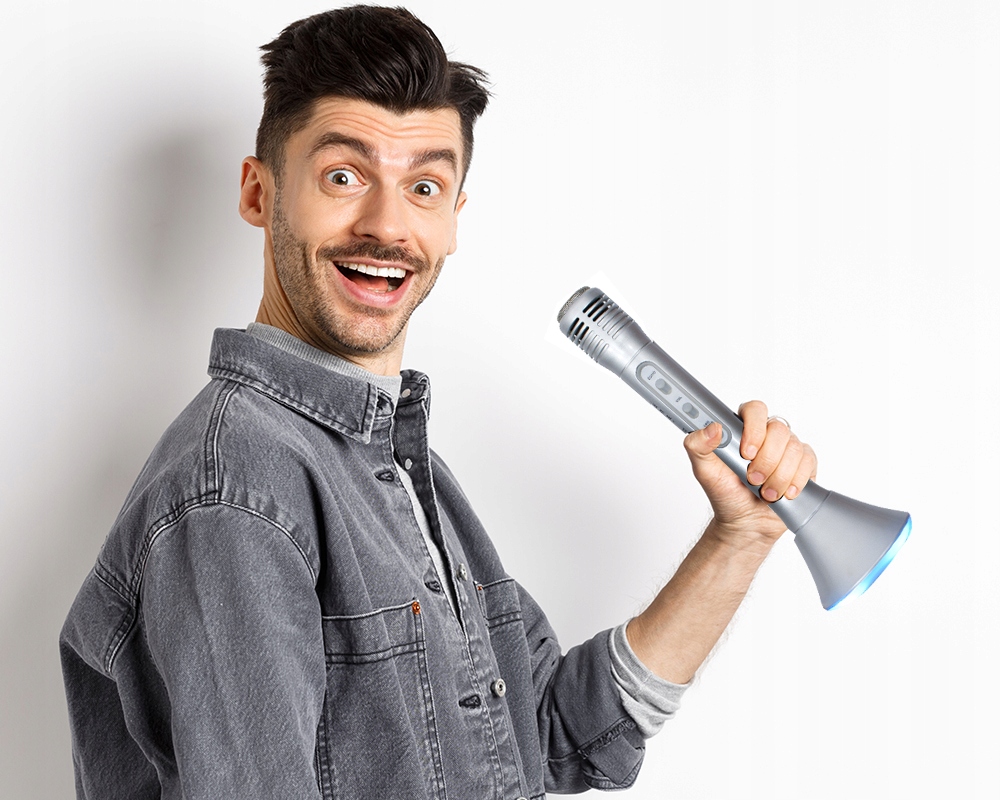 🔊 Гаджет оснащений вбудованим динаміком, мікрофоном і меню, завдяки якому ми можемо керувати функціями мікрофона. Мікрофон світить світлодіодним підсвічуванням у ритмі музики, має триустаткування для будь-якого випадку!