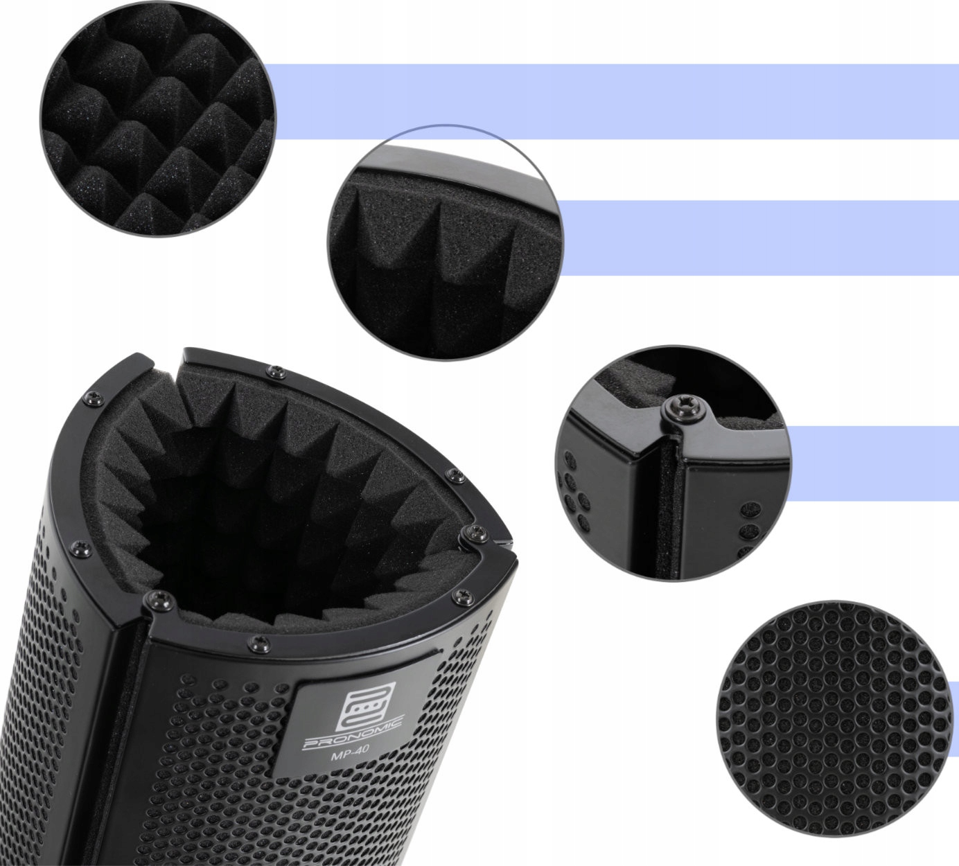 Proline MP-40 складається з портативного поглинача і дифузора для мікрофонного запису, а також настільної мікрофонної стійки. На нього можна встановити будь-який звичайний мікрофон з різьбою 5/8".