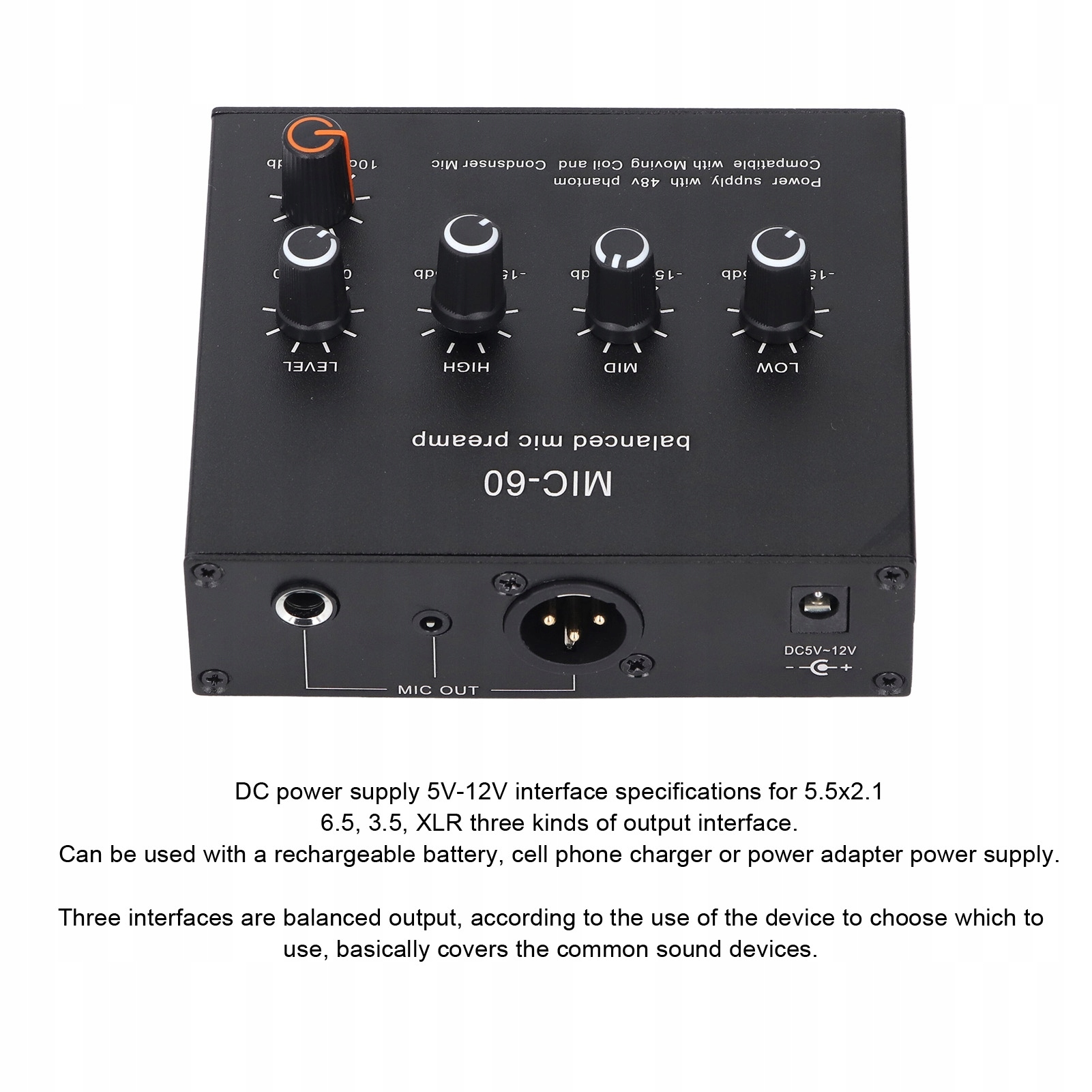 3. [Powering] The microphone preamplifier operates on the power interface from DC5 to 12 V, can be powered by a power bank or mobile adowarka and has a built -in Phantom Phantom power supply 48 v.
