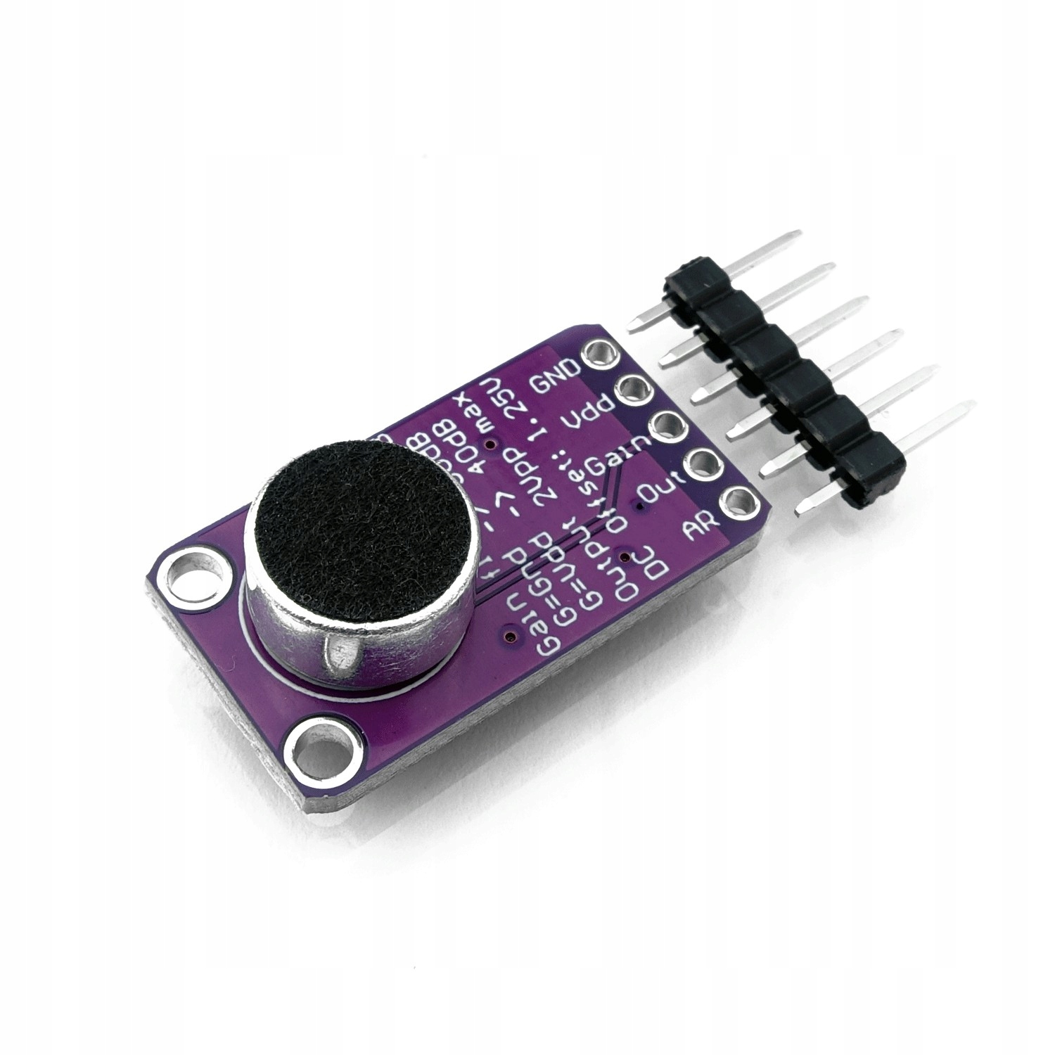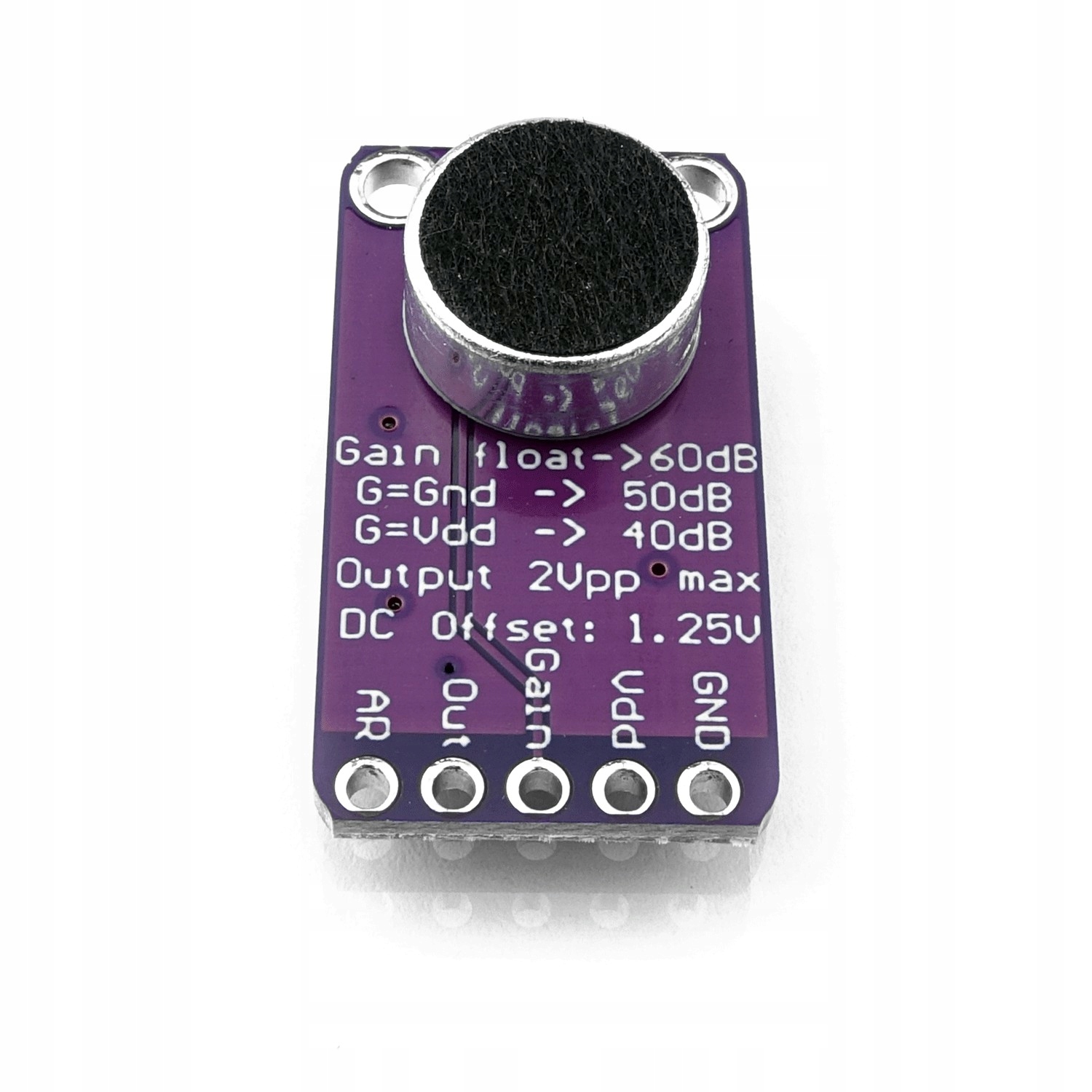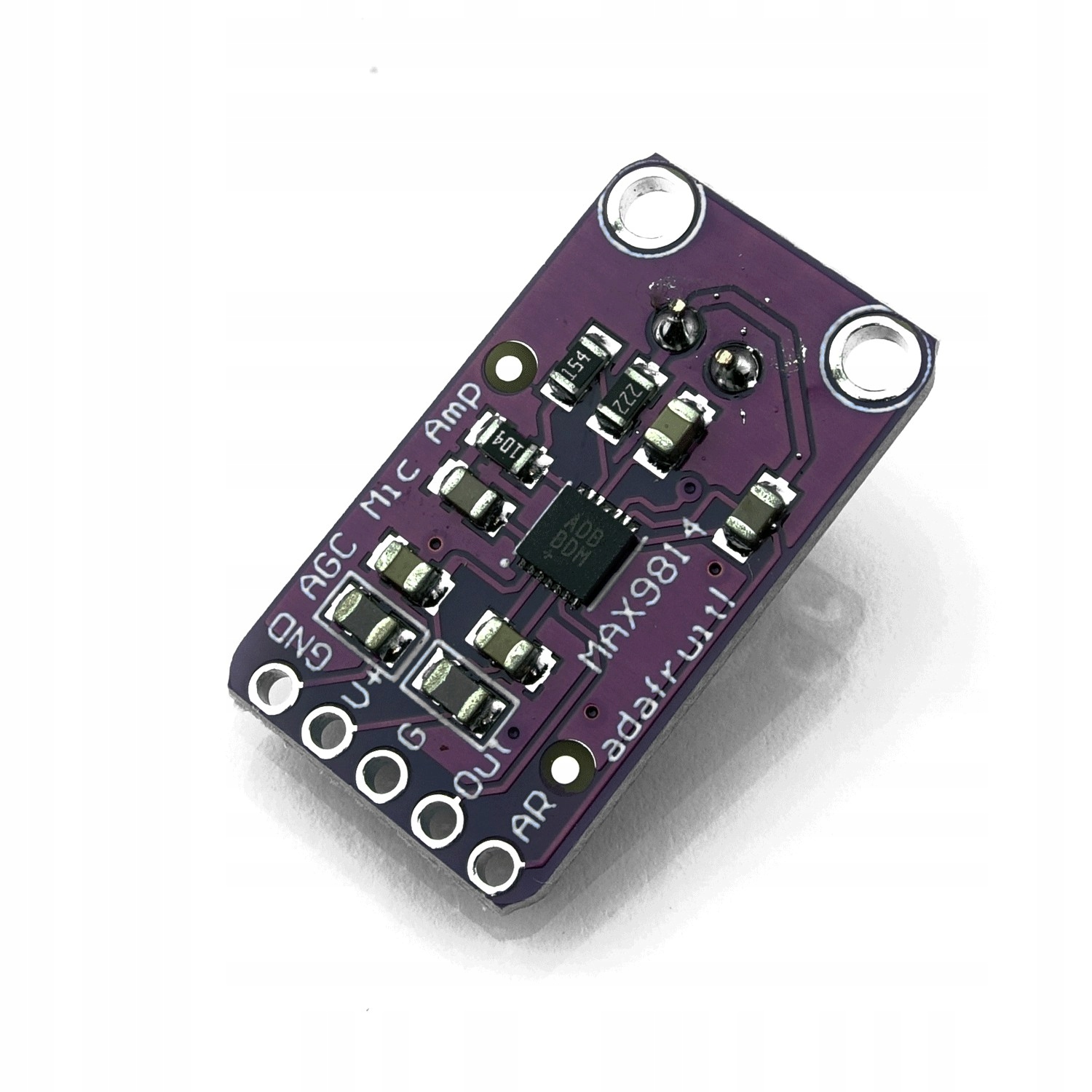 Мікрофонний підсилювач MAX9814 з електретним мікрофоном живиться напругою від 2,7 В до 5,5 В. Він має можливість встановити посилення. Максимальна вихідна напруга вдвічі перевищує вхідну напругу.