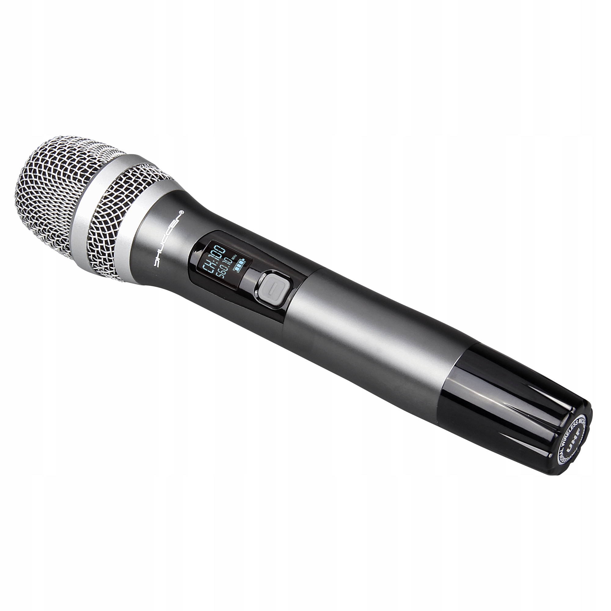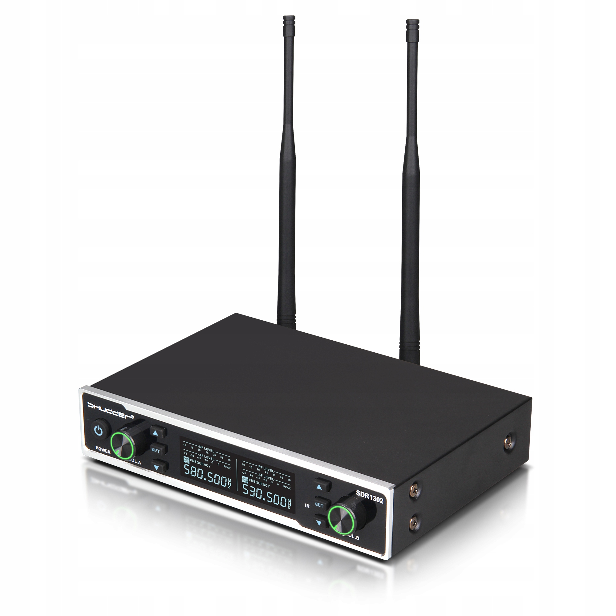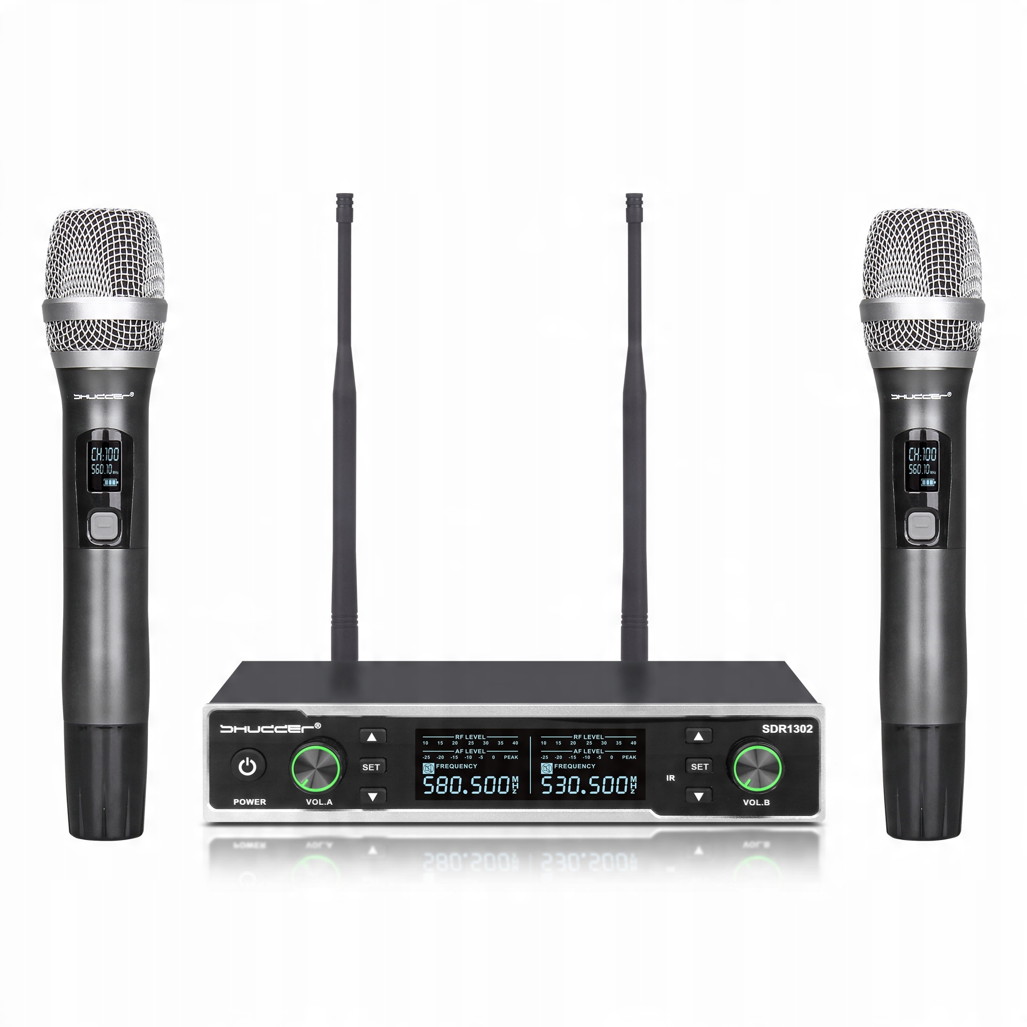 Надзвичайно міцна конструкція бездротових мікрофонів SHUDDER SDR1302. У цей набір входять два ручних мікрофона SHUDDER зі змінними каналами, металевий корпус передавача та дисплей у передавачі, який інформує про стан батареї, діапазон, у якому відбулося з’єднання, і канал, у якому ми працюємо.
