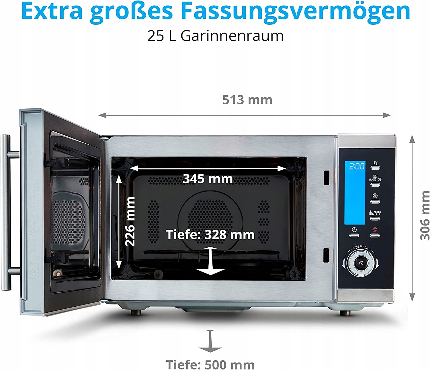 Основна особливість: цей кухонний помічник — це не лише класична мікрохвильова піч, а й конвекційна піч та подвійна гриль. Для користувача це означає: розігрів, випікання та смаження в одному пристрої. Це подвійно практично, оскільки ви також економите час під час прибирання - внутрішню частину з високоякісної нержавіючої сталі можна очистити миттєво. Завдяки цьому ви можете легко готувати смачні страви та мати багато часу для приємних речей у житті!