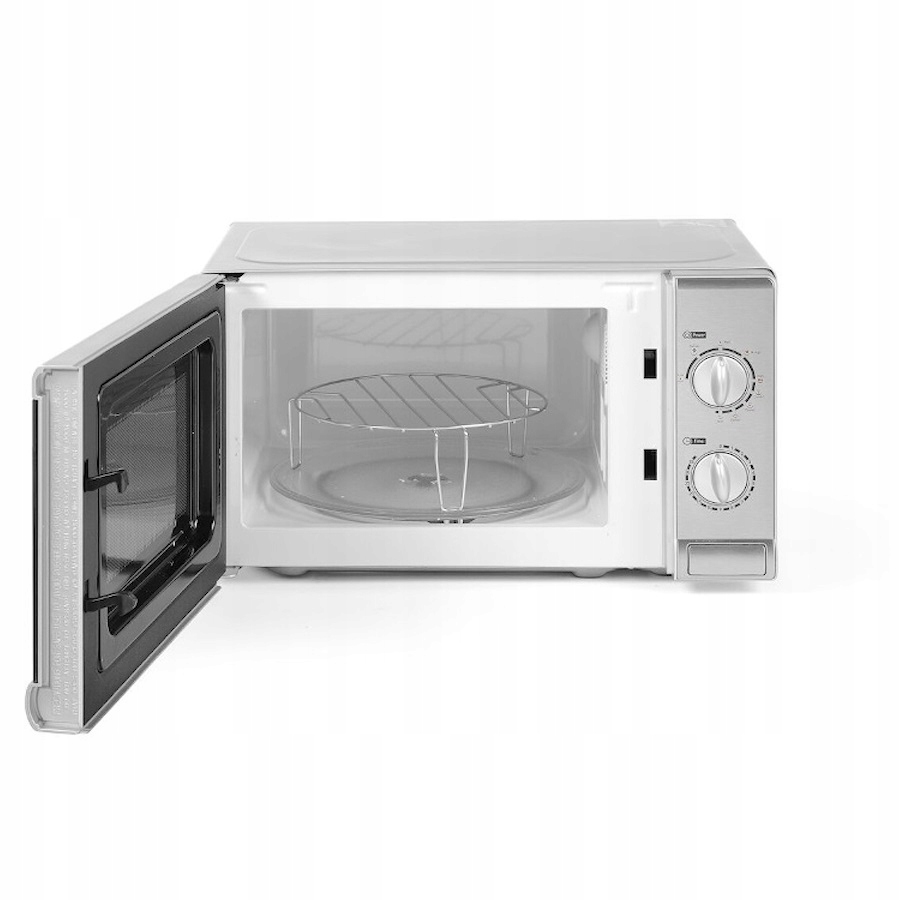 Мікрохвильова піч з функцією гриль. Ручне керування за допомогою двох ручок - ручки регулювання часу та ручки регулювання потужності та ручки вибору параметрів. Вхідна потужність 1050 Вт, вихідна потужність мікрохвильової печі 700 Вт або потужність гриля 1000 Вт. Таймер до 35 хвилин. Ємність: 20 літрів.