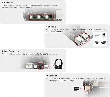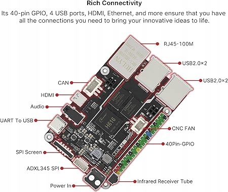 - Основна плата резервує інтерфейс дисплея HDMI2.0A для підтримки дисплея 4K; вбудований 4-сторонній порт USB2.0; 40-контактний GPIO; Аудіоінтерфейс 3,5 мм.