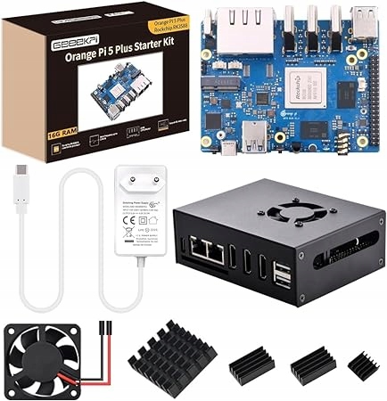 - GeeekPi Orange Pi 5 Plus Starter Kit оснащений більшістю периферійних пристроїв, необхідних для надійного, високопродуктивного пристрою. Сюди входить 1 шт. плати Orange Pi 5 Plus (16 ГБ оперативної пам’яті), 1 шт. металевого корпусу з 40-мм вентилятором, 1 шт. офіційного адаптера живлення Orange Pi 5 В 4 A USB C, 4 шт. радіаторів.