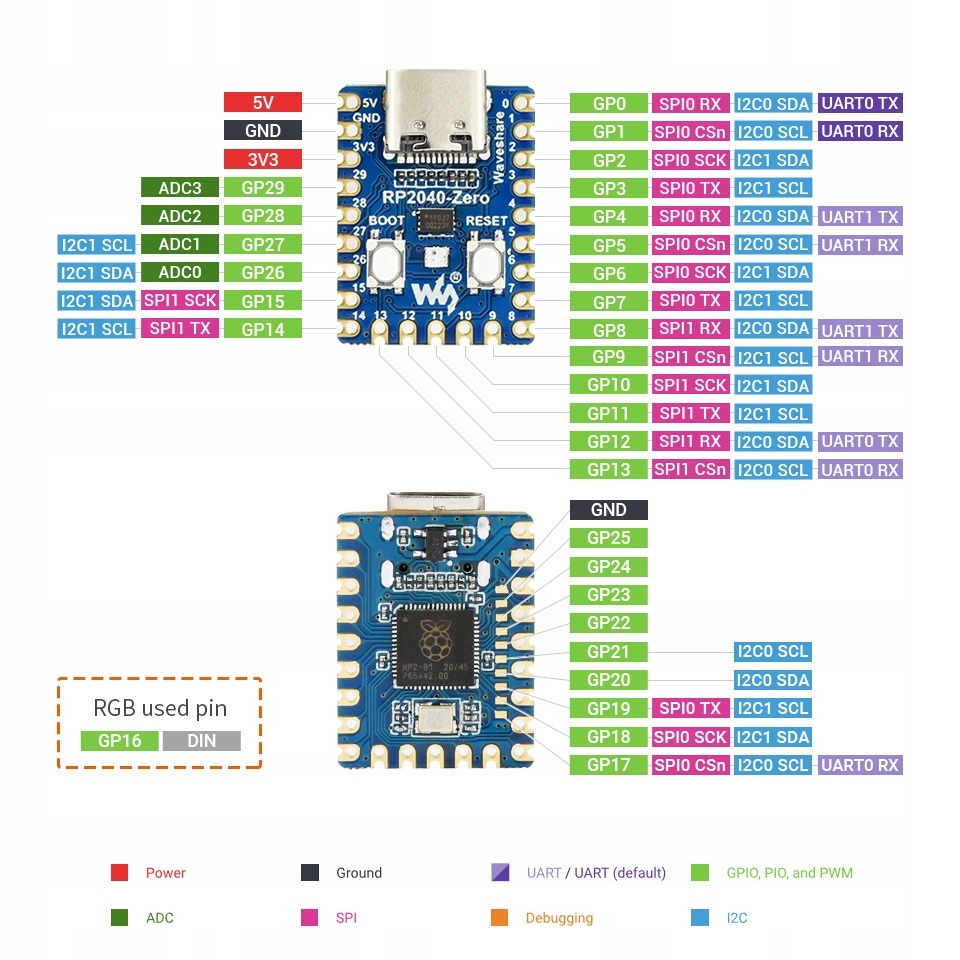 Крім системи RP2040 і флеш-пам'яті, користувач має в своєму розпорядженні стабілізатор напруги 3,3 В, кнопки завантаження і живлення, діод RGB і Роз’єм USB Type-C для живлення та програмування. Модуль і виходи GPIO з периферійними пристроями, такими як 12-розрядні входи АЦП, ШІМ, інтерфейс I2C, SPI та UART.