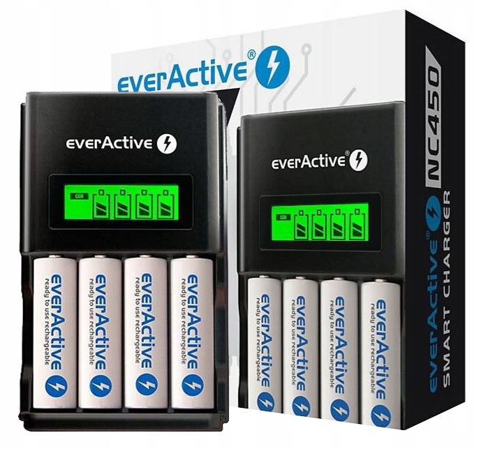 Зарядний пристрій everActive NC-450 має 4 повністю незалежні зарядні канали. Дозволяє швидко заряджати від 1 до 4 Ni-MH елементів будь-якої ємності та розміру (R03 AAA / R6 AA) у будь-якій конфігурації.