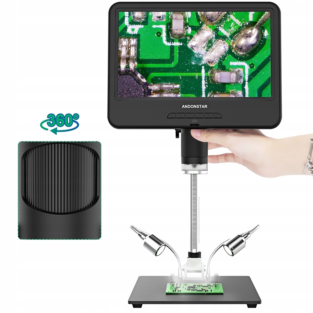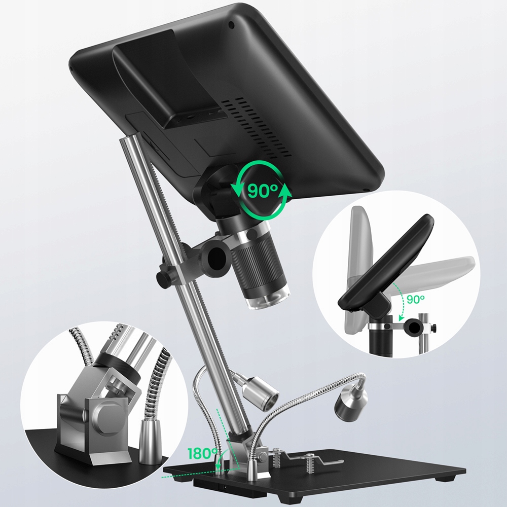 Цей мікроскоп має 10,1-дюймовий РК-дисплей, роздільну здатність 800*1280P і 2-мегапіксельне зображення для чіткої якості зображення, а екран можна повертати на 180°. Конструкція із регульованим збільшенням у 260 разів із функцією запису фото та відео. 8 світлодіодних ламп у нижній частині об’єктива та 2 додаткові світлодіодні лампи в основі штатива, регульована яскравість, роблять зображення різкішим і чіткішим. Регульований на 180° металевий кронштейн, регулюйте його спереду і ззаду, створюючи 3D-візуальний ефект і збільшуючи робочий простір. Дві металеві затискачі на чорній металевій базовій пластині можуть міцно зафіксувати об’єкт спостереження. Доступний для різних випадків, він задовольняє потреби всіх типів мікроскопії та підходить для ідентифікації друкованих плат, ідентифікації антикваріату, точного гравіювання, перевірки зовнішнього вигляду продукту, наукового спостереження та перевірки лінії в електронній промисловості.