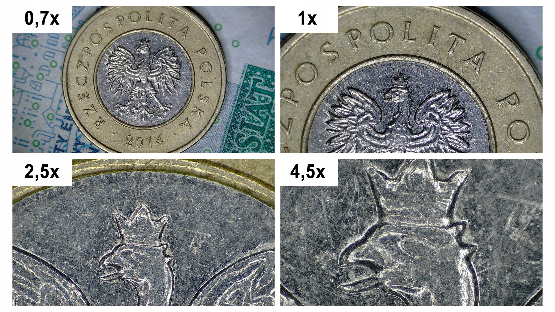 з об'єктивом Barlow 0,75x - робочий простір: 36см, поле зору: 62 мм - з мінімальним збільшенням (для підключення об'єктива Barlow 0,75x через великий робочий простір повинен бути зроблений мікроскоп)
