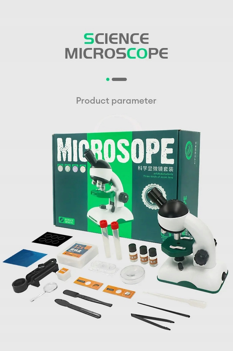 Почніть захоплюючу пригоду у світі науки з нашим набором наукового мікроскопа для дітей! Цей навчальний набір ідеально підходить для юних дослідників, які хочуть відкрити таємниці природи та науки. Ідеально підходить для дітей віком від 6 років, цей набір поставляється з кількома комбінаціями збільшення (200X, 600X, 1200X), що дозволяє проводити точні спостереження за різними зразками.