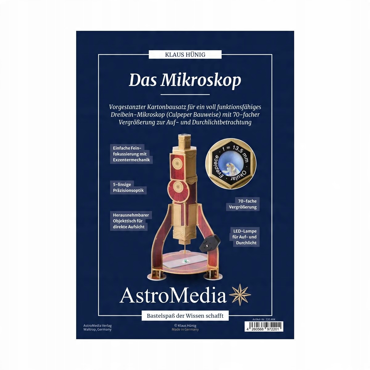 На відміну від інших мікроскопів, столик мікроскопа AstroMedia є знімним. Це дозволяє після встановлення предметного столика переглядати невеликі зразки в прохідному світлі (після розміщення їх на предметних стеклах). Після видалення предметного столика мікроскоп можна розташувати безпосередньо над об’єктом, який розглядають – навіть відносно великим – і розглядати його у відбитому світлі. Освітлення забезпечує вбудований світлодіод, точний ексцентриситет полегшує фокусування, а рамка з чотирьох шарів картону забезпечує надійну стійкість всієї конструкції.