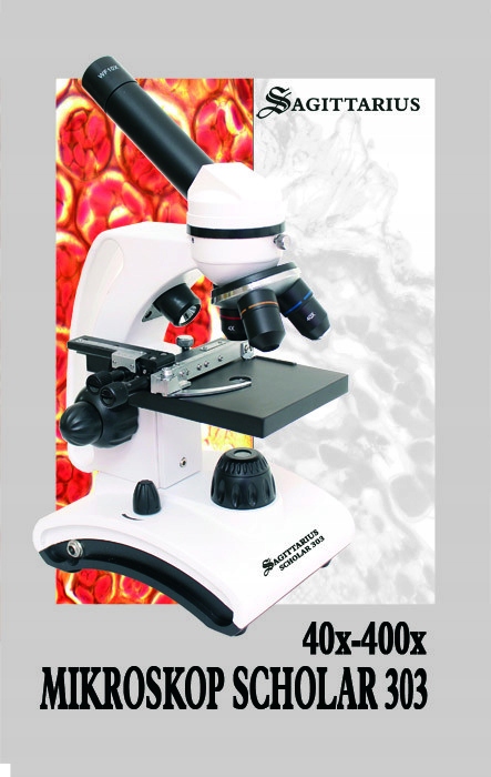 Мікроскоп Sagittarius-SCHOLAR 303, 40x-400x, гвинт мікро-макро, хрестовий столик, акумулятор і джерело живлення