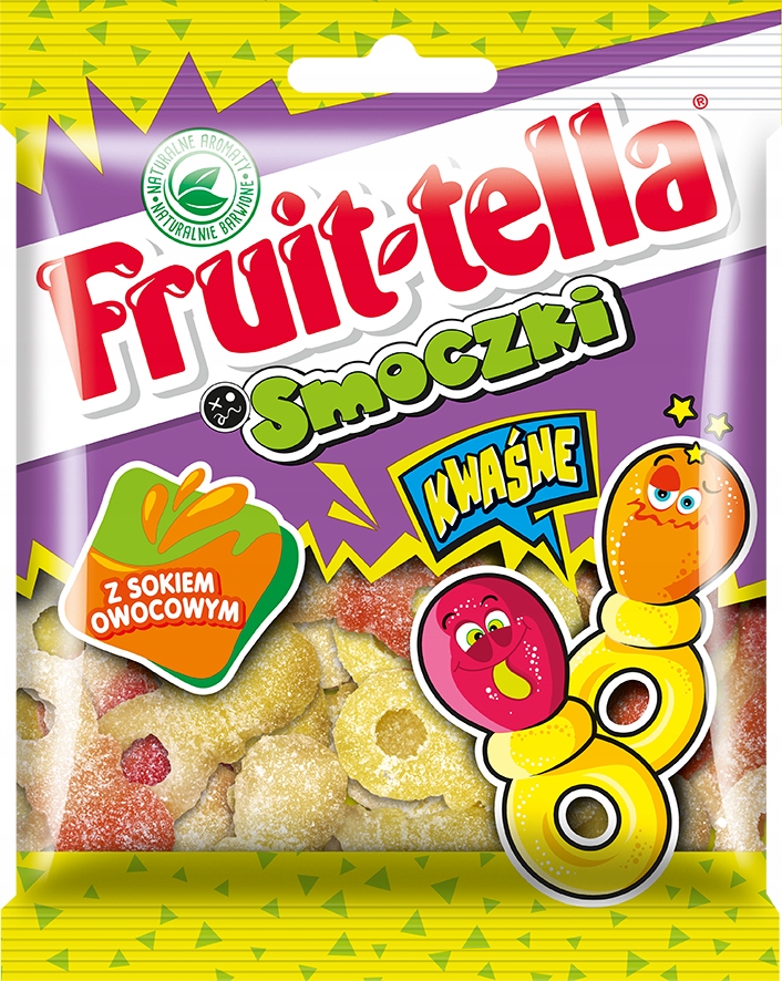 Желе Fruittella - це желе з кислими фруктами у формі вигадливих пустушок! Вони містять фруктові соки, а кожне желе вкрите кислинкою. Продукт природного кольору, містить натуральні ароматизатори.