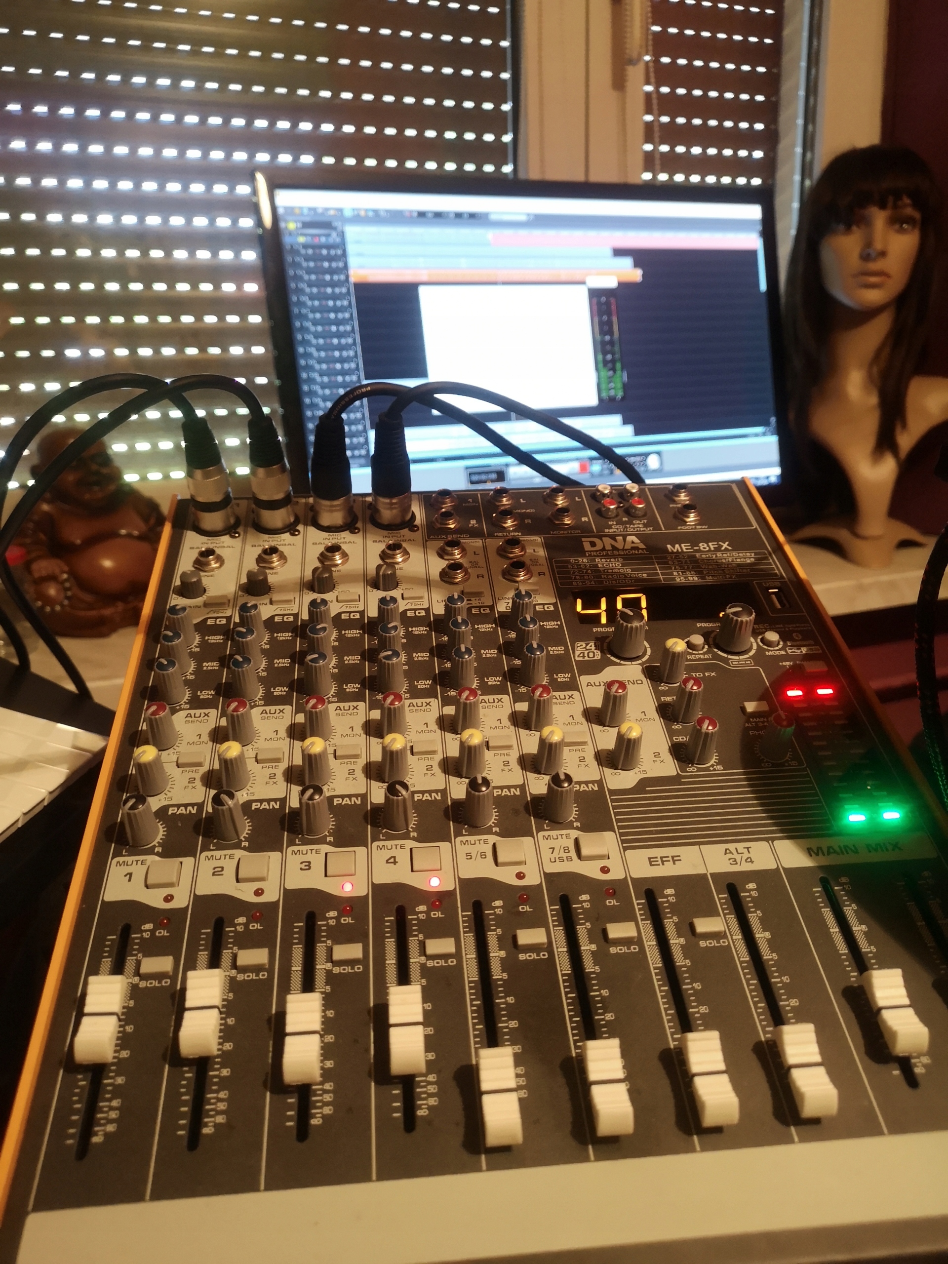 Основний розділ ME-8FX дозволяє загальне регулювання гучності для всіх каналів, контроль рівня сигналу одного з 99 вбудованих ефектів, таких як реверберація, затримка або хорус , а також налаштування гучності для треків AUX, CD/TAPE і навушників.