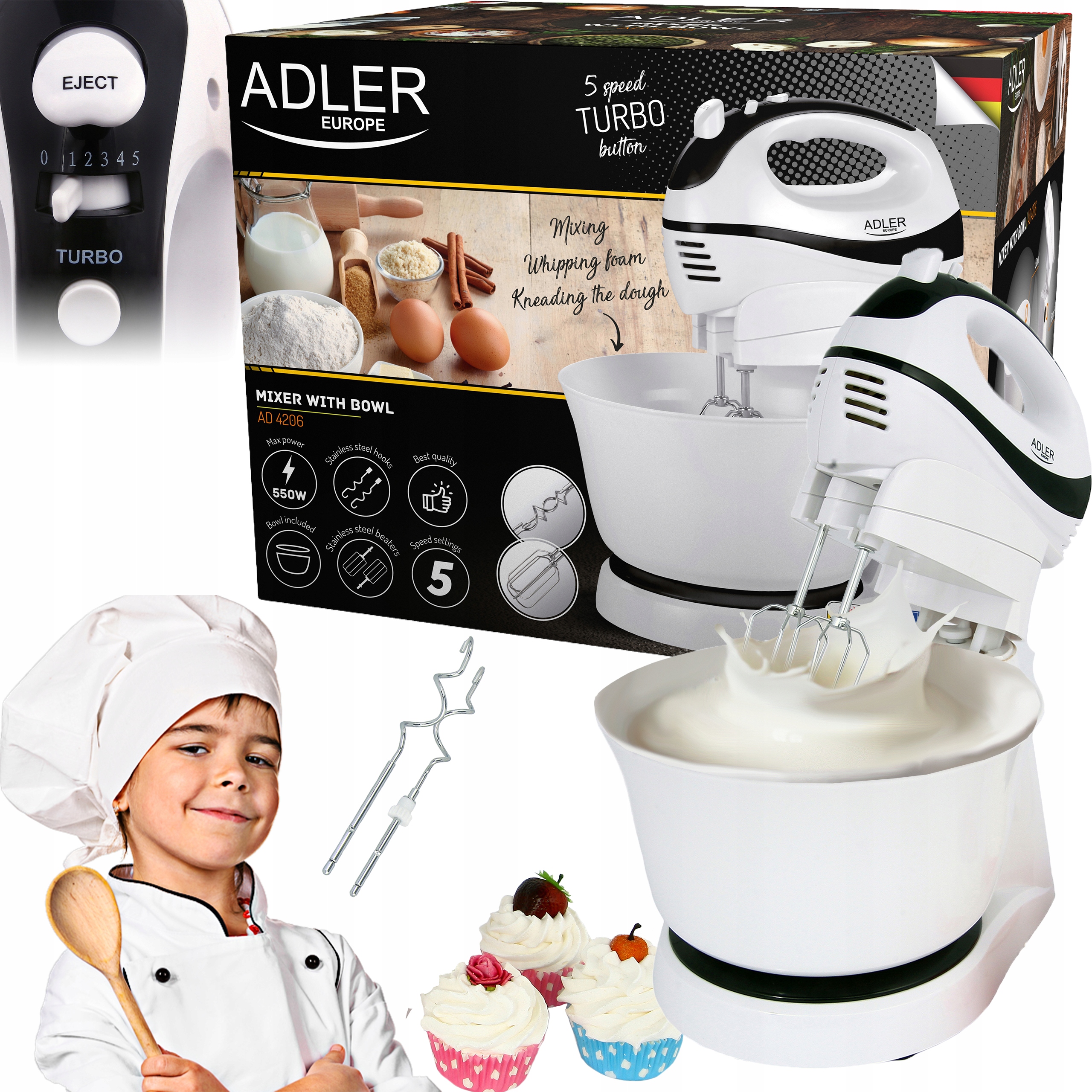 | ПОТУЖНІСТЬ 550 Вт | ОБРАТНА ЧАША | ЕРГОНОМІЧНА РУЧКА | ФУНКЦІЯ ТУРБО | 2 ЗМІШУВАЧІ З НЕРЖАВІЮЧОЇ СТАЛІ | 2 ВУСИ З НЕРЖАВІЮЧОЇ СТАЛІ | РЕГУЛЬОВАНА ШВИДКІСТЬ - 5 ПЕРЕДАЧ | ФУНКЦІЯ EJECT - СТІЙКИЙ МОНТАЖ ЗМІШУВАЧІВ |
