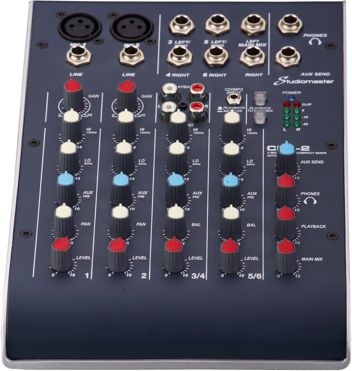Мікшер C2-2 2 мікрофонних каналу - бюджетний мікшер з хорошими параметрами і великими можливостями Оснащений двома мікрофонно-лінійними входами з регулюванням чутливості і перемиканням фантомного живлення для конденсаторних мікрофонів і двома стереовходами. Всі входи Studiomaster C2-2 мають двосмуговий еквалайзер - бас і високі частоти. Мікшер Studiomaster C2-2 з 2 мікрофонними каналами забезпечує високу якість звуку в цьому ціновому класі. Рекомендуємо.